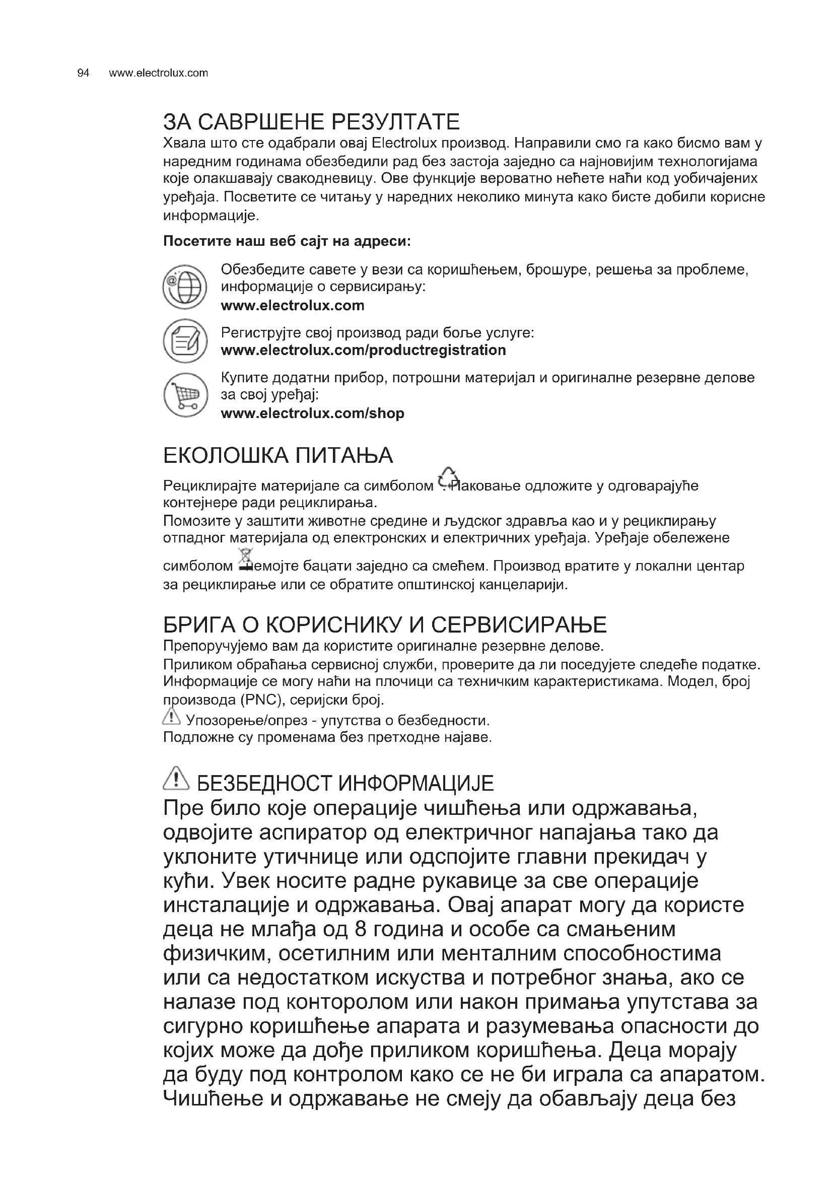 ЗА САВРШЕНЕ РЕЗУЛТАТЕ Хвала што сте одабрали овај Electrolux производ. Направили смо га како бисмо вам у наредним годинама обезбедили рад без застоја заједно са најновијим технологијама које олакшавају свакодневицу. Ове функције вероватно нећете наћи код уобичајених уређаја. Посветите се читању у наредних неколико минута како бисте добили корисне информације. Посетите наш веб сајт на адреси: Обезбедите савете у вези са коришћењем, брошуре, решења за проблеме, информације о сервисирању: www.electrolux.com Региструјте свој производ ради боље услуге: www.electrolux.com/productregistration Купите додатни прибор, потрошни материјал и оригиналне резервне делове за свој уређај: www.electrolux.com/shop ЕКОЛОШКА ПИТАЊА Рециклирајте материјале са симболом . Паковање одложите у одговарајуће контејнере ради рециклирања. Помозите у заштити животне средине и људског здравља као и у рециклирању отпадног материјала од електронских и електричних уређаја. Уређаје обележене симболом немојте бацати заједно са смећем. Производ вратите у локални центар за рециклирање или се обратите општинској канцеларији. БРИГА О КОРИСНИКУ И СЕРВИСИРАЊЕ Препоручујемо вам да користите оригиналне резервне делове. Приликом обраћања сервисној служби, проверите да ли поседујете следеће податке. Информације се могу наћи на плочици са техничким карактеристикама. Модел, број производа (PNC), серијски број. Упозорење/опрез - упутства о безбедности. Подложне су променама без претходне најаве. БЕЗБЕДНОСТ ИНФОРМАЦИЈЕ Пре било које операције чишћења или одржавања, одвојите аспиратор од електричног напајања тако да уклоните утичнице или одспојите главни прекидач у кући. Увек носите радне рукавице за све операције инсталације и одржавања. Овај апарат могу да користе деца не млађа од 8 година и особе са смањеним физичким, осетилним или менталним способностима или са недостатком искуства и потребног знања, ако се налазе под конторолом или након примања упутстава за сигурно коришћење апарата и разумевања опасности до којих може да дође приликом коришћења. Деца морају да буду под контролом како се не би играла са апаратом. Чишћење и одржавање не смеју да обављају деца без SR КОРИСНИЧКО УПУТСТВО95
