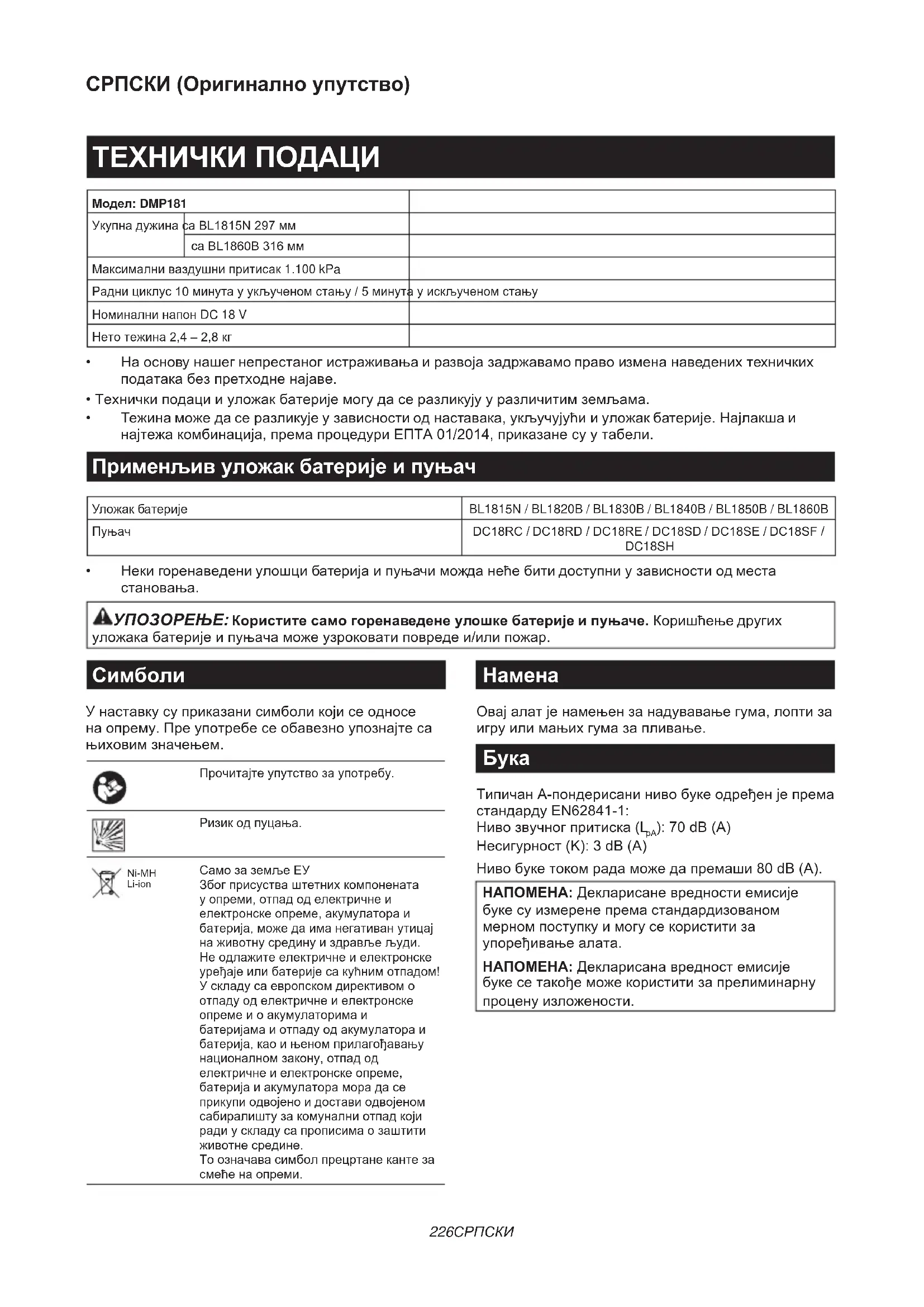 - Оригинална батерија и полнач на Makita НАПОМЕНА: Некои ставки на листата може да се вклучени со алатот како стандарден прибор. Тие може да се разликуваат од држава до држава.226 СРПСКИ СРПСКИ (Оригинално упутство) ТЕХНИЧКИ ПОДАЦИ Модел: DMP181 Укупна дужина са BL1815N 297 мм са BL1860B 316 мм Максимални ваздушни притисак 1.100 kPa Радни циклус 10 минута у укљученом стању / 5 минута у искљученом стању Номинални напон DC 18 V Нето тежина 2,4 – 2,8 кг