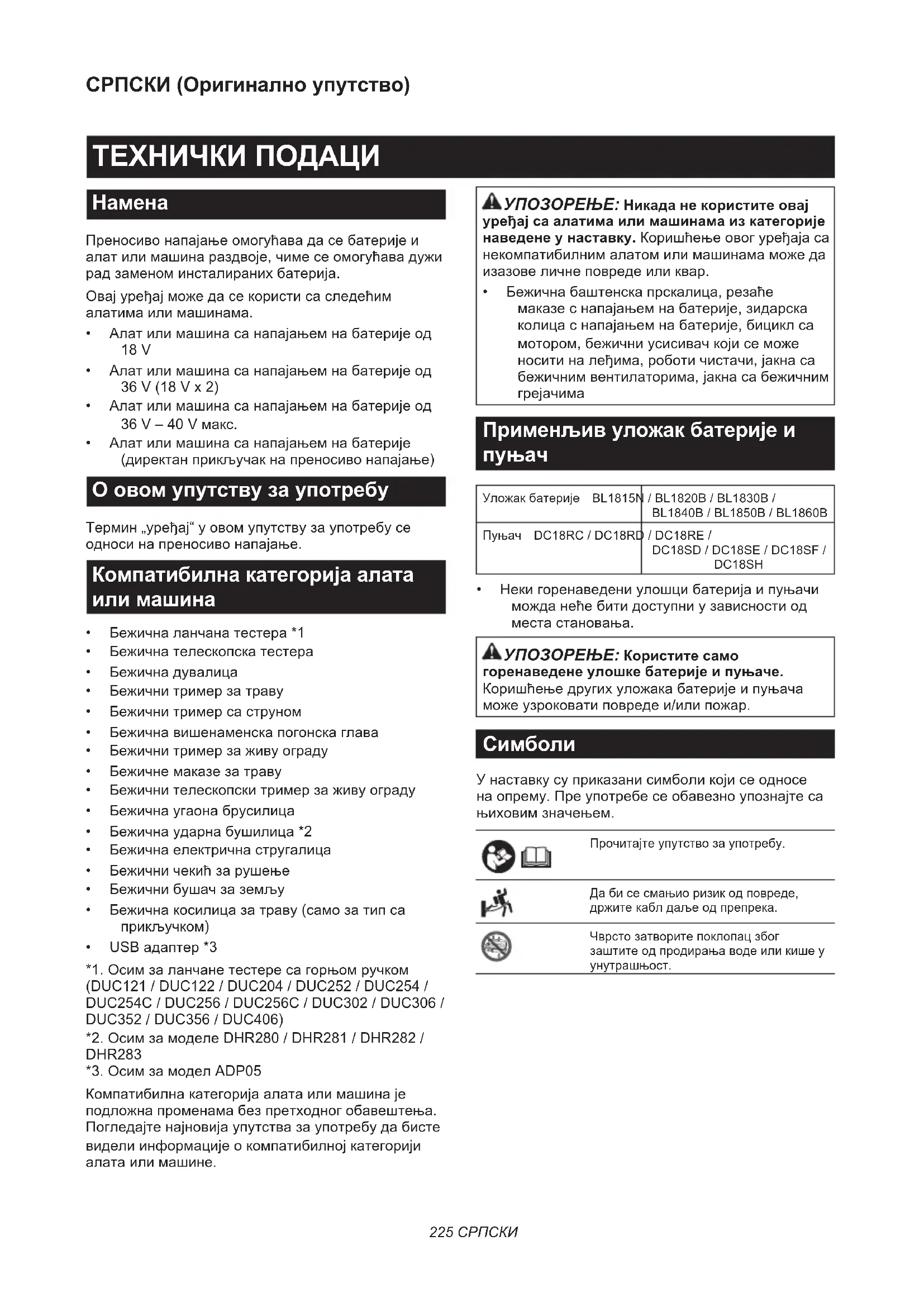 - Алатилимашинасанапајањемнабатерије (директанприкључакнапреносивонапајање) О овом упутству за употребу Термин„уређај“уовомупутствузаупотребусе односинапреносивонапајање. Компатибилна категорија алата