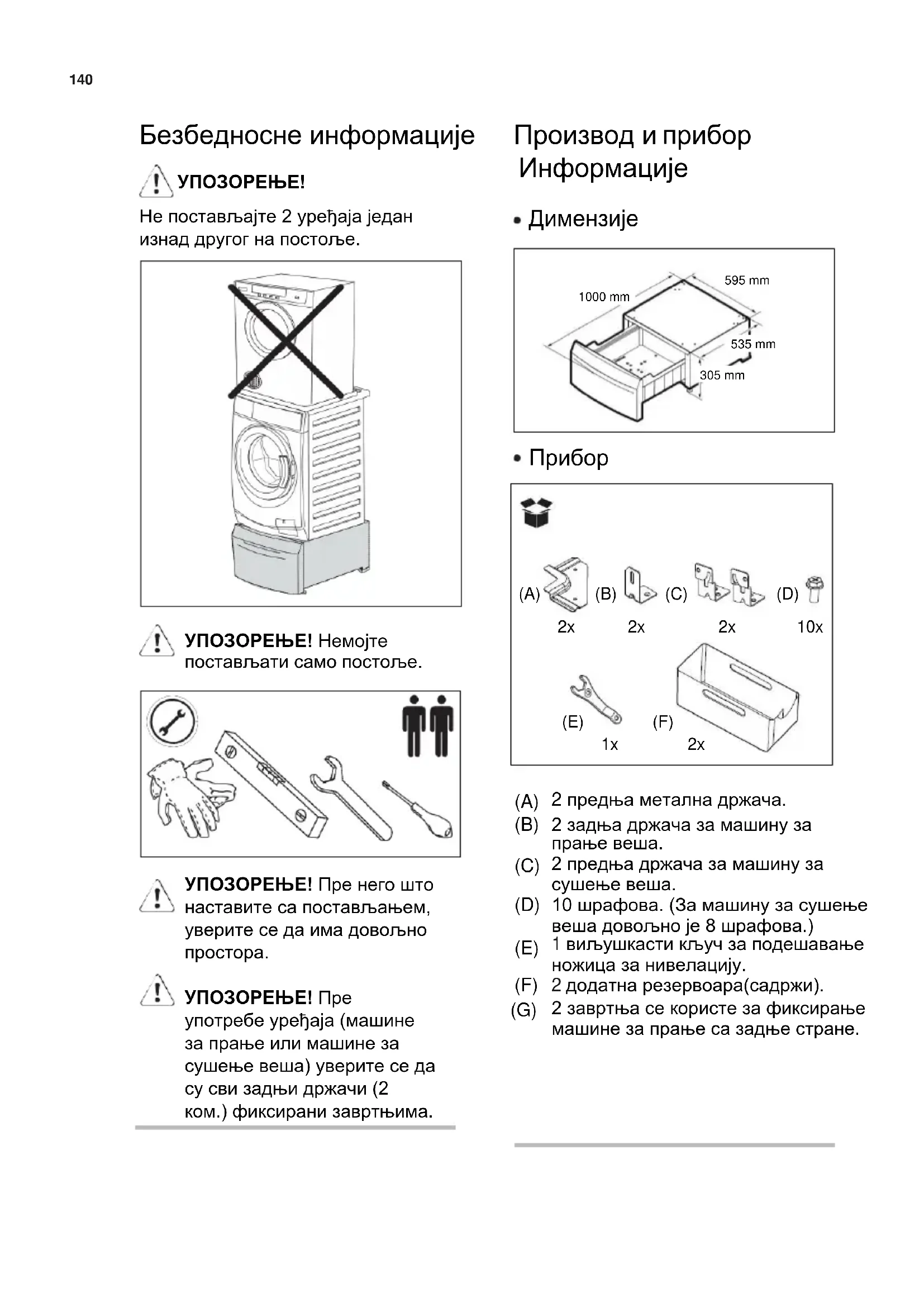 (A) (B) (C) (D) (E) (F) (G) 2 предња метална држача. 2 задња држача за машину за прање веша. 2 предња држача за машину за сушење веша. 10 шрафова. (За машину за сушење веша довољно је 8 шрафова.) виљушкасти кључ за подешавање ножица за нивелацију. додатна резервоара(садржи). 2 завртња се користе за фиксирање машине за прање са задње стране.