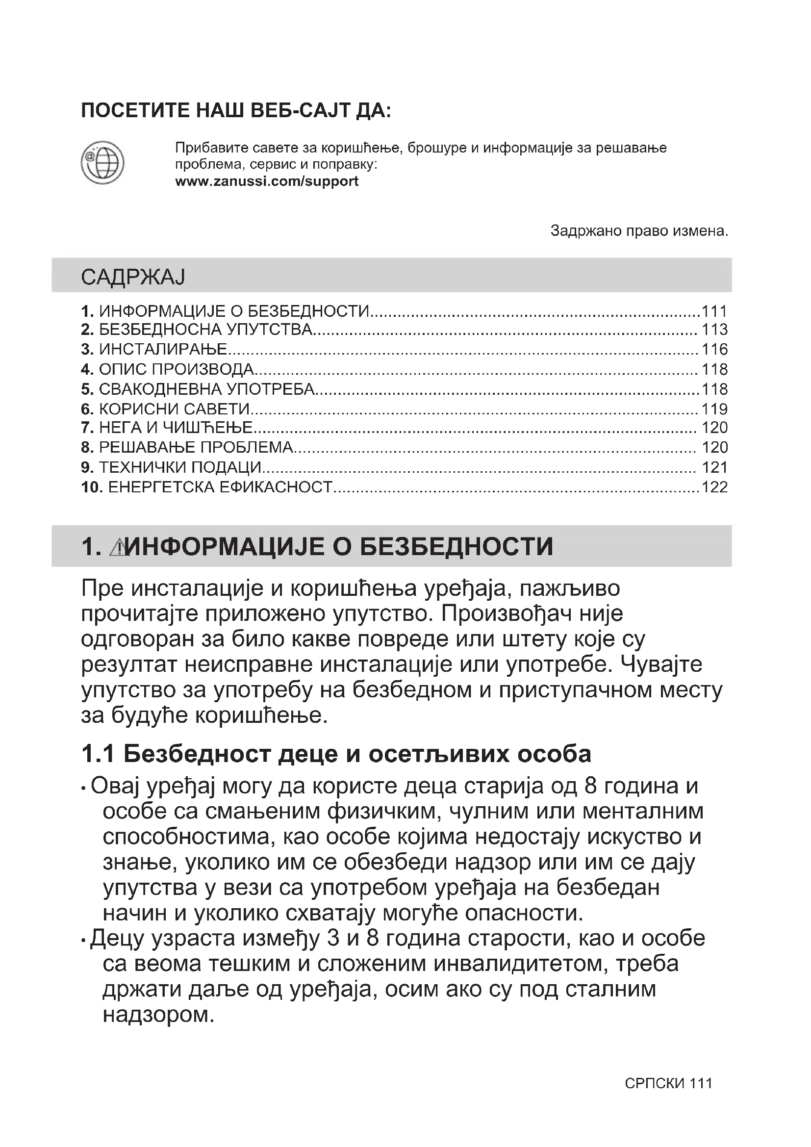 Рециклирајте материјале са симболом . Паковање одложите у одговарајуће контејнере ради рециклирања. Помозите у заштити животне средине и људског здравља као и у рециклирању отпадног материјала од електронских и електричних уређаја. Уређаје обележене симболом немојте бацати заједно са смећем. Производ вратите у локални центар за рециклирање или се обратите општинској канцеларији. 122 СРПСКИOBIŠČITE NAŠE SPLETNO MESTO ZA: Pridobitev nasvetov glede uporabe, brošure, odpravljanje težav, servisne informacijein informacije glede popravil:www.zanussi.com/supportPridržujemo si pravico do sprememb. KAZALO