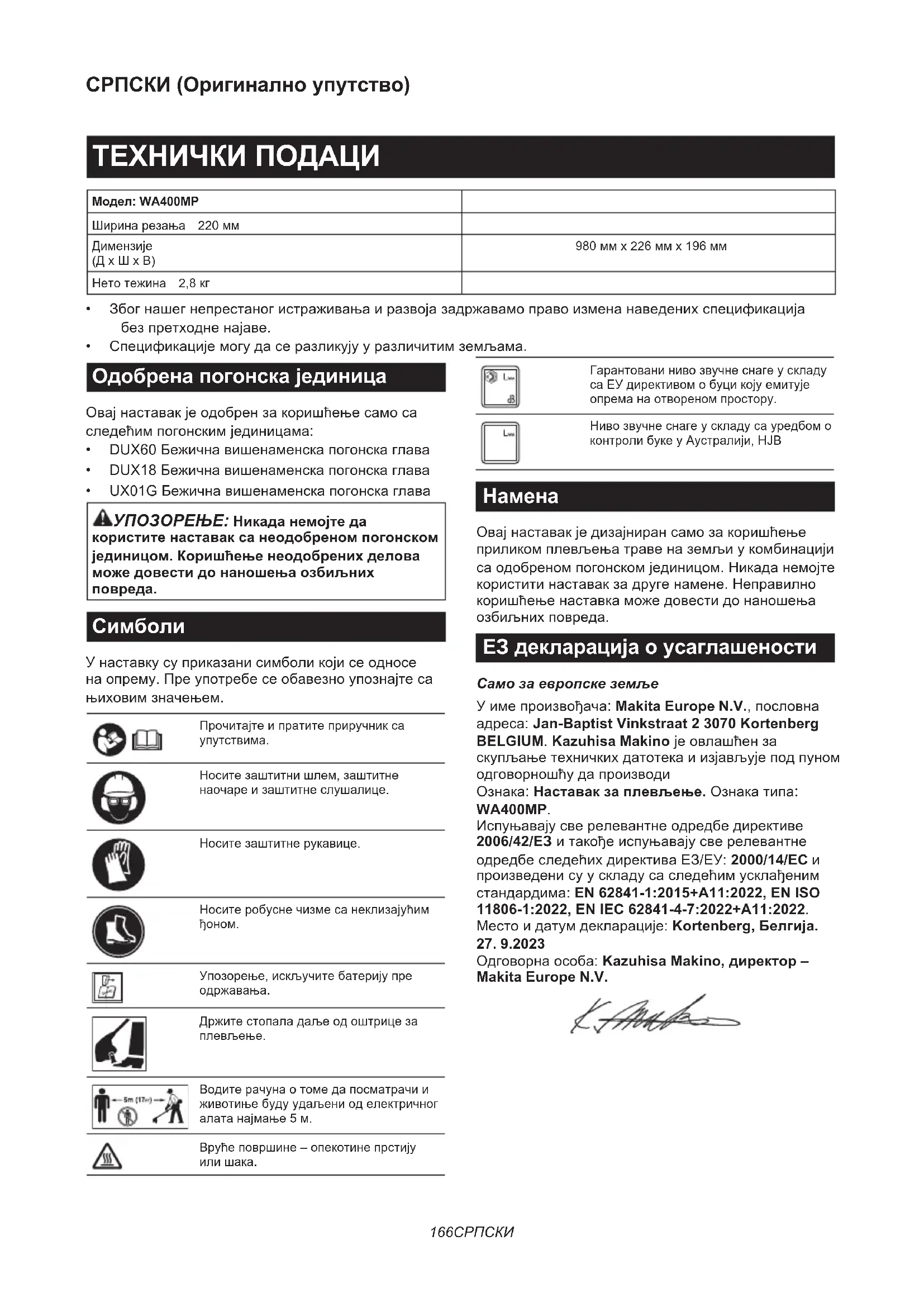 Овајнаставакједизајнирансамозакоришћење приликомплевљењатравеназемљиукомбинацији саодобреномпогонскомјединицом.Никаданемојте користитинаставакзадругенамене.Неправилно коришћењенаставкаможедовестидонаношења озбиљнихповреда. ЕЗ декларација о усаглашености Само за европске земље Уимепроизвођача:Makita Europe N.V.,пословна адреса:Jan-Baptist Vinkstraat 2 3070 Kortenberg BELGIUM. Kazuhisa Makinoјеовлашћенза скупљањетехничкихдатотекаиизјављујеподпуном одговорношћудапроизводи Ознака:Наставак за плевљење.Ознакатипа: WA400MP. Испуњавајусверелевантнеодредбедирективе 2006/42/ЕЗитакођеиспуњавајусверелевантне одредбеследећихдирективаЕЗ/ЕУ:2000/14/ECи произведенисуускладусаследећимусклађеним стандардима:EN 62841-1:2015+A11:2022, EN ISO 11806-1:2022, EN IEC 62841-4-7:2022+A11:2022. Местоидатумдекларације:Kortenberg, Белгија.