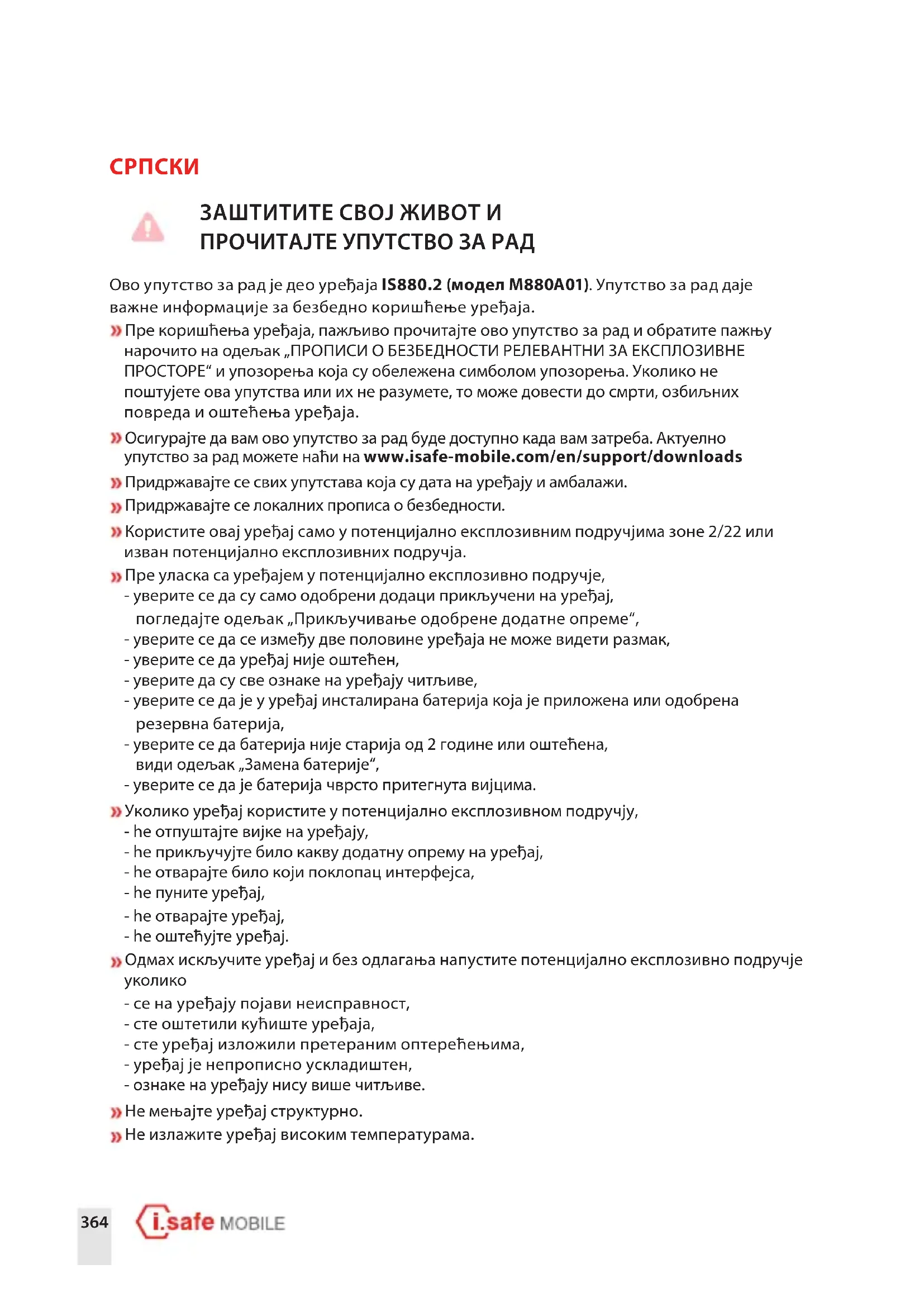 ЗАШТИТИТЕ СВОЈ ЖИВОТ И ПРОЧИТАЈТЕ УПУТСТВО ЗА РАД Ово упутство за рад је део уређаја IS880.2 (модел M880A01). Упутство за рад даје важне информације за безбедно коришћење уређаја. Пре коришћења уређаја, пажљиво прочитајте ово упутство за рад и обратите пажњу нарочито на одељак „ПРОПИСИ О БЕЗБЕДНОСТИ РЕЛЕВАНТНИ ЗА ЕКСПЛОЗИВНЕ ПРОСТОРЕ“ и упозорења која су обележена симболом упозорења. Уколико не поштујете ова упутства или их не разумете, то може довести до смрти, озбиљних повреда и оштећења уређаја. Осигурајте да вам ово упутство за рад буде доступно када вам затреба. Актуелно упутство за рад можете наћи на www.isafe-mobile.com/en/support/downloads Придржавајте се свих упутстава која су дата на уређају и амбалажи. Придржавајте се локалних прописа о безбедности. Користите овај уређај само у потенцијално експлозивним подручјима зоне 2/22 или изван потенцијално експлозивних подручја. Пре уласка са уређајем у потенцијално експлозивно подручје, - уверите се да су само одобрени додаци прикључени на уређај, погледајте одељак „Прикључивање одобрене додатне опреме“, - уверите се да се између две половине уређаја не може видети размак, - уверите се да уређај није оштећен, - уверите да су све ознаке на уређају читљиве, - уверите се да је у уређај инсталирана батерија која је приложена или одобрена резервна батерија, - уверите се да батерија није старија од 2 године или оштећена, види одељак „Замена батерије“, - уверите се да је батерија чврсто притегнута вијцима. Уколико уређај користите у потенцијално експлозивном подручју, - hе отпуштајте вијке на уређају, - hе прикључујте било какву додатну опрему на уређај, - hе отварајте било који поклопац интерфејса, - hе пуните уређај, - hе отварајте уређај, - hе оштећујте уређај. Одмах искључите уређај и без одлагања напустите потенцијално експлозивно подручје