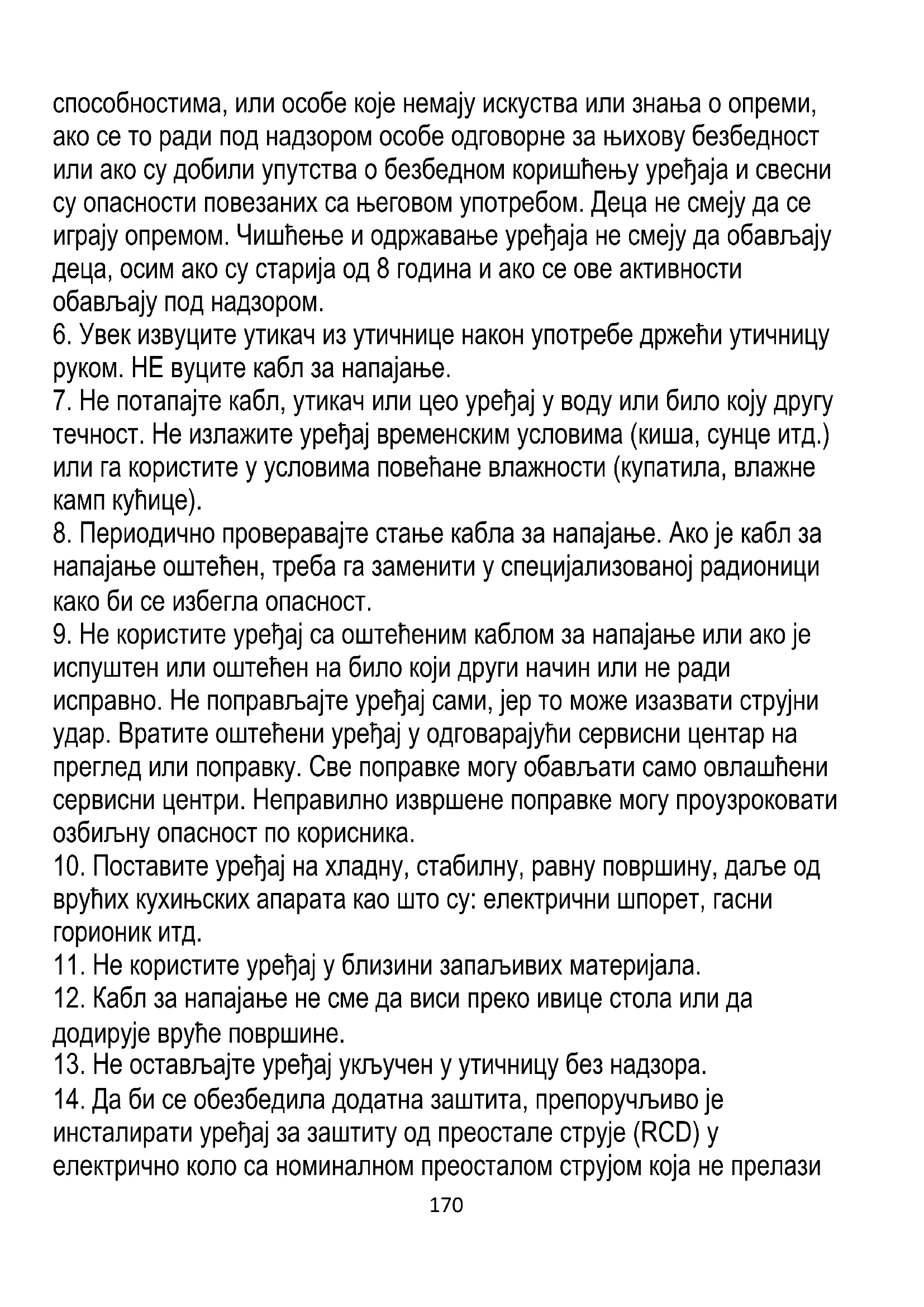 и особе са ограниченим физичким, сензорним или менталним170 способностима, или особе које немају искуства или знања о опреми, ако се то ради под надзором особе одговорне за њихову безбедност или ако су добили упутства о безбедном коришћењу уређаја и свесни су опасности повезаних са његовом употребом. Деца не смеју да се играју опремом. Чишћење и одржавање уређаја не смеју да обављају деца, осим ако су старија од 8 година и ако се ове активности обављају под надзором.