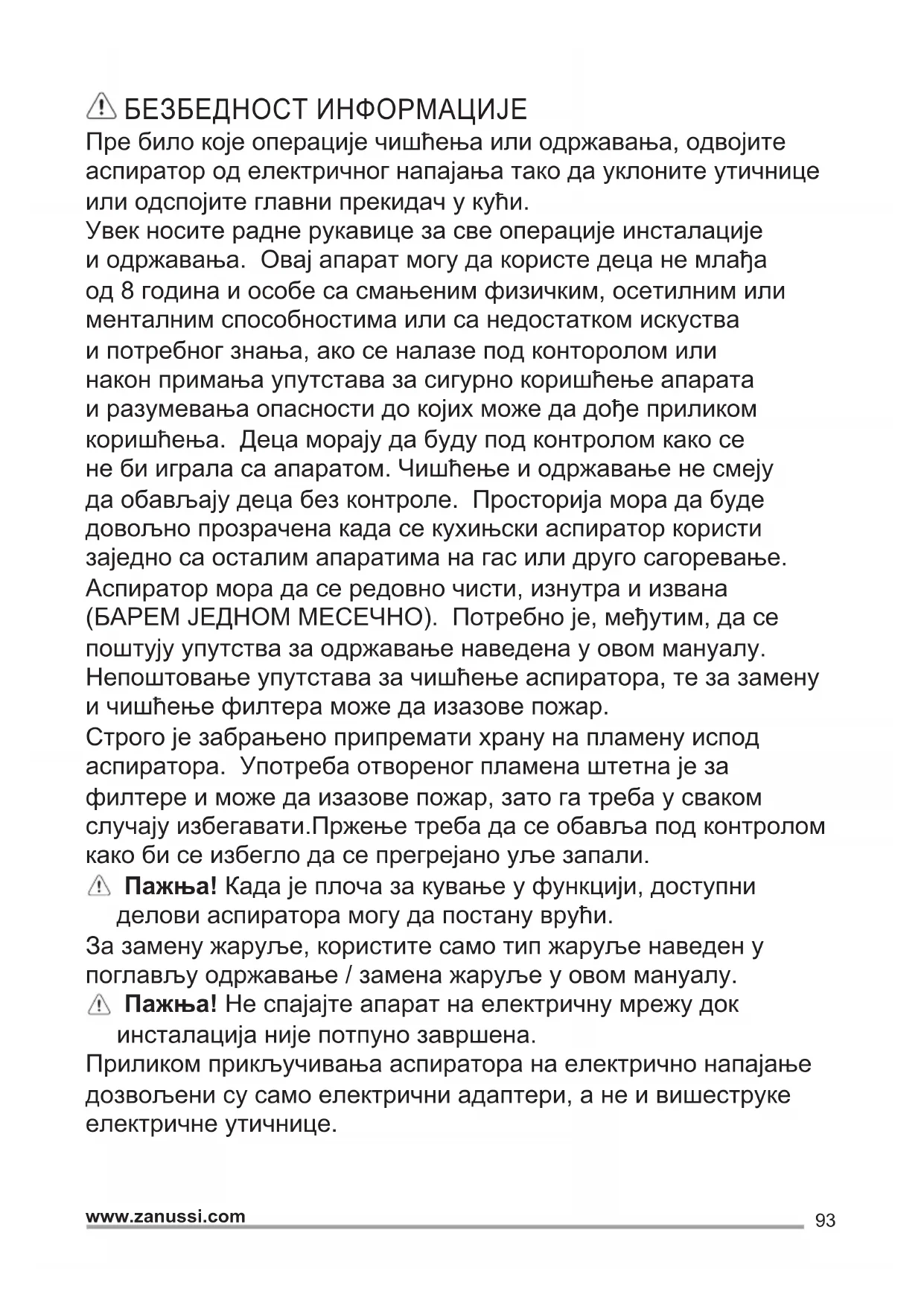 1 ON/OFF светла 2 OFF мотори 3 Моќ на всмукување минимална 4 Моќ на всмукување средна 5 Моќ на всмукување максимална Користете ја најголемата брзина во случај на невообичаена концентрација на пареи во кујната. Ви препорачуваме да го вклучите издувувањето 5 минути пред да започнете со готвењето и да го оставите да работи околу 15 минути по завршување на готвењето. ЕДИНИЦА ЗА ОСВЕТЛУВАЊЕ Исклучете го уредот од струјното напојување. Предупредување! Пред да ги допрете сијаличките проверете дали се изладени. Да се користи само ЛЕД лампа од максимум 3W-E14. За повеќе детали, консултирајте се со приложениот документ "ILCOS D" (бр. "1d").93 www.zanussi.com БЕЗБЕДНОСТ ИНФОРМАЦИЈЕ Пре било које операције чишћења или одржавања, одвојите аспиратор од електричног напајања тако да уклоните утичнице или одспојите главни прекидач у кући. Увек носите радне рукавице за све операције инсталације и одржавања. Овај апарат могу да користе деца не млађа од 8 година и особе са смањеним физичким, осетилним или менталним способностима или са недостатком искуства и потребног знања, ако се налазе под конторолом или након примања упутстава за сигурно коришћење апарата и разумевања опасности до којих може да дође приликом коришћења. Деца морају да буду под контролом како се не би играла са апаратом. Чишћење и одржавање не смеју да обављају деца без контроле. Просторија мора да буде довољно прозрачена када се кухињски аспиратор користи заједно са осталим апаратима на гас или друго сагоревање. Аспиратор мора да се редовно чисти, изнутра и извана (БАРЕМ ЈЕДНОМ МЕСЕЧНО). Потребно је, међутим, да се поштују упутства за одржавање наведена у овом мануалу. Непоштовање упутстава за чишћење аспиратора, те за замену и чишћење филтера може да изазове пожар. Строго је забрањено припремати храну на пламену испод аспиратора. Употреба отвореног пламена штетна је за филтере и може да изазове пожар, зато га треба у сваком случају избегавати.Пржење треба да се обавља под контролом како би се избегло да се прегрејано уље запали. Пажња! Када је плоча за кување у функцији, доступни делови аспиратора могу да постану врући. За замену жаруље, користите само тип жаруље наведен у поглављу одржавање / замена жаруље у овом мануалу. Пажња! Не спајајте апарат на електричну мрежу док инсталација није потпуно завршена. Приликом прикључивања аспиратора на електрично напајање дозвољени су само електрични адаптери, а не и вишеструке електричне утичнице.94 www.zanussi.com БЕЗБЕДНОСНА УПУТСТВА Што се тиче техничких мера и мера сигурности које морају се да предузму приликом испуштања пара, треба се строго придржавати одредби и прописа локалних власти. Испушни ваздух не сме да буде преношен каналом за испуштање пара произведених од стране апарата на гас или друго сагоревање. Немојте да користите или остављате аспиратор без правилно монтираних жаруља због могуће опасности од струјног удара. Никада не користите аспиратор без правилно монтиране мреже! Аспиратор се не сме НИКАДА користити као површина за одлагање, осим ако то није изричито наведено. Користите само шарафе за монтажу испоручене са производом, или, ако нису испоручени, купите правилну врсту шрафова. Користите правилну дужину за шарафе, наведену у Водичу за инсталацију. Ако сте у недоумици, обратите се овлашћеном сервису или сличном квалификованом особљу. ПАЖЊА! Н