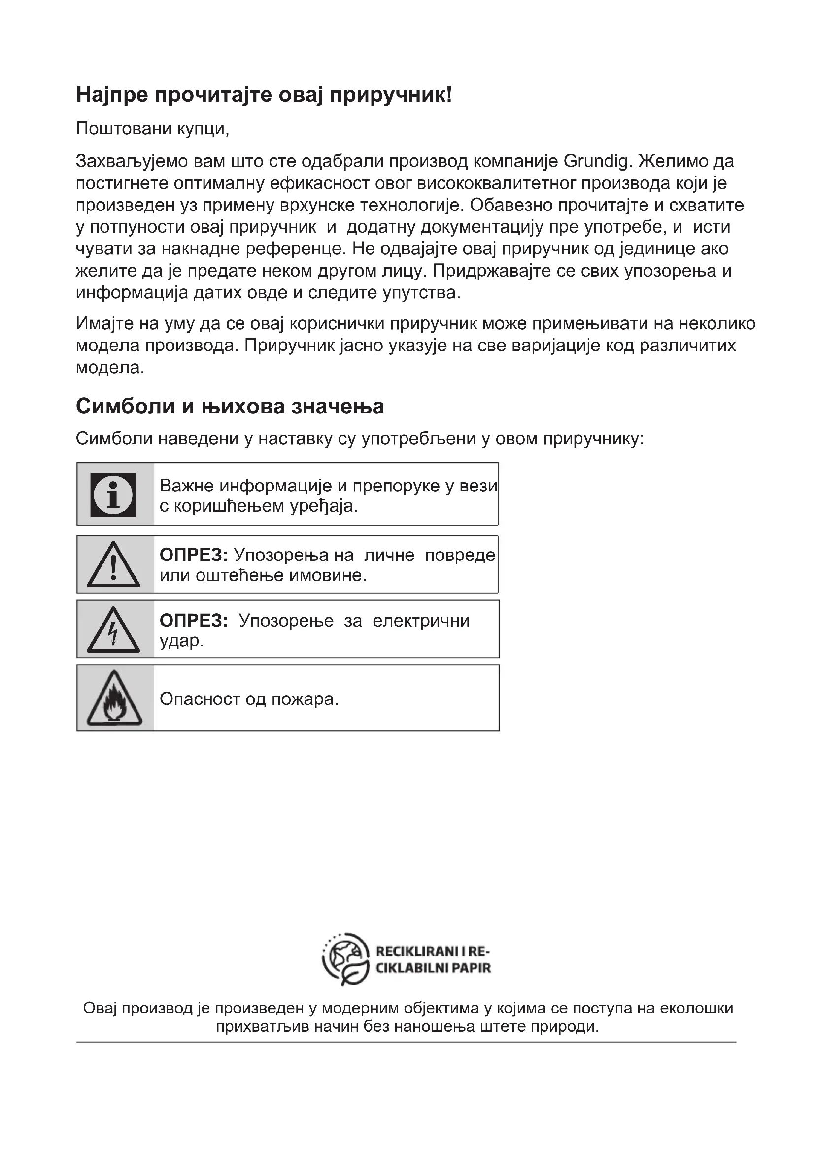 - Grundig производи су у складу са важећим безбедносним стан- дардима; према томе, у случају било каквих оштећења на уређају или каблу за напајање, исте треба да поправи или замени прода- вач, сервисни центар или стручно лице и ов- лашћени сервис како би се избегла било каква опасност. Неисправни или неквалификовани радови на поправци могу бити опасни и могу довести до опасности за