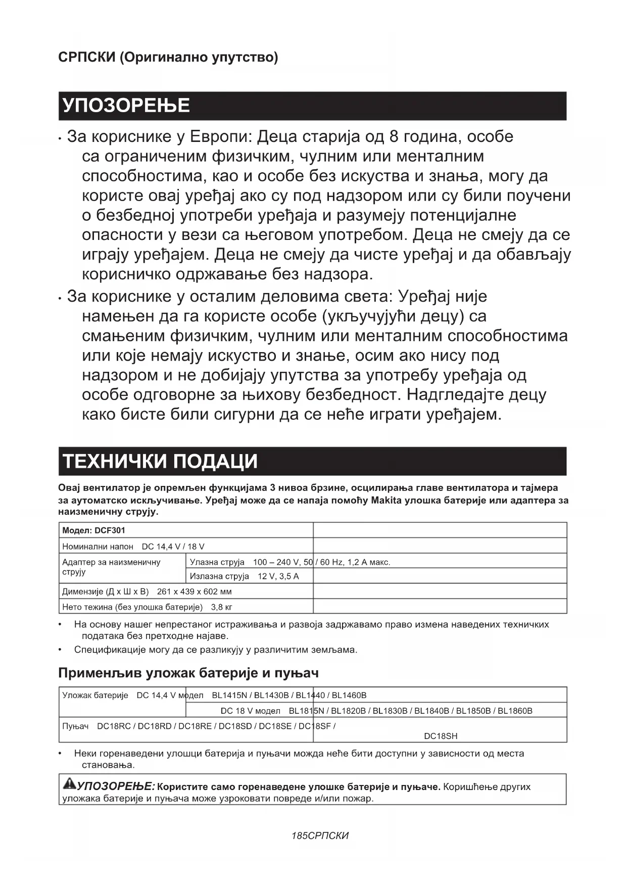 - Закорисникеуосталимделовимасвета:Уређајније намењендагакористеособе(укључујућидецу)са смањенимфизичким,чулнимилименталнимспособностима иликојенемајуискуствоизнање,осимаконисупод надзороминедобијајуупутствазаупотребууређајаод особеодговорнезањиховубезбедност.Надгледајтедецу какобистебилисигурнидасенећеигратиуређајем. ТЕХНИЧКИ ПОДАЦИ Овај вентилатор је опремљен функцијама 3 нивоа брзине, осцилирања главе вентилатора и тајмера за аутоматско искључивање. Уређај може да се напаја помоћу Makita улошка батерије или адаптера за наизменичну струју. Модел: DCF301Номиналнинапон DC 14,4 V / 18 VАдаптерзанаизменичнуструјуУлазнаструја 100–240V,50/60Hz,1,2Aмакс.Излазнаструја 12 V, 3,5 AДимензије(ДхШхВ) 261x439x602ммНетотежина(безулошкабатерије) 3,8кг