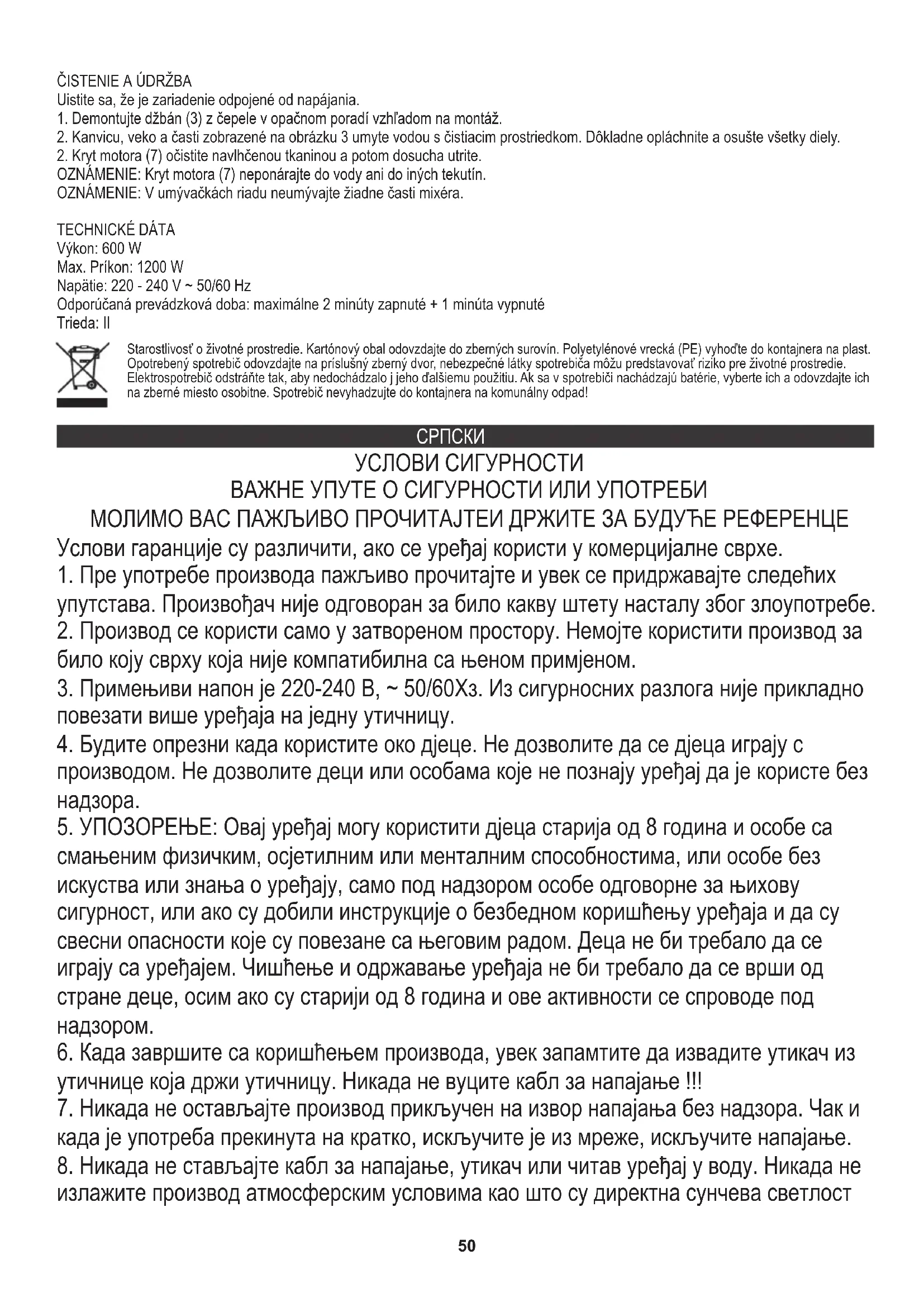 ОБАВИЈЕСТ: Не урањајте кућиште мотора (7) у воду или друге течности. ТЕХНИЧКИ ПОДАЦИ ОБАВИЈЕСТ: Не перите ниједне дијелове блендера у машинама за судове. Снага: 600В Макс. Снага: 1200В Препоручено време рада: укључено је максимално 2 минута + искључено 1 минуту Напон: 220-240В ~ 50 / 60Хз Класа: II54