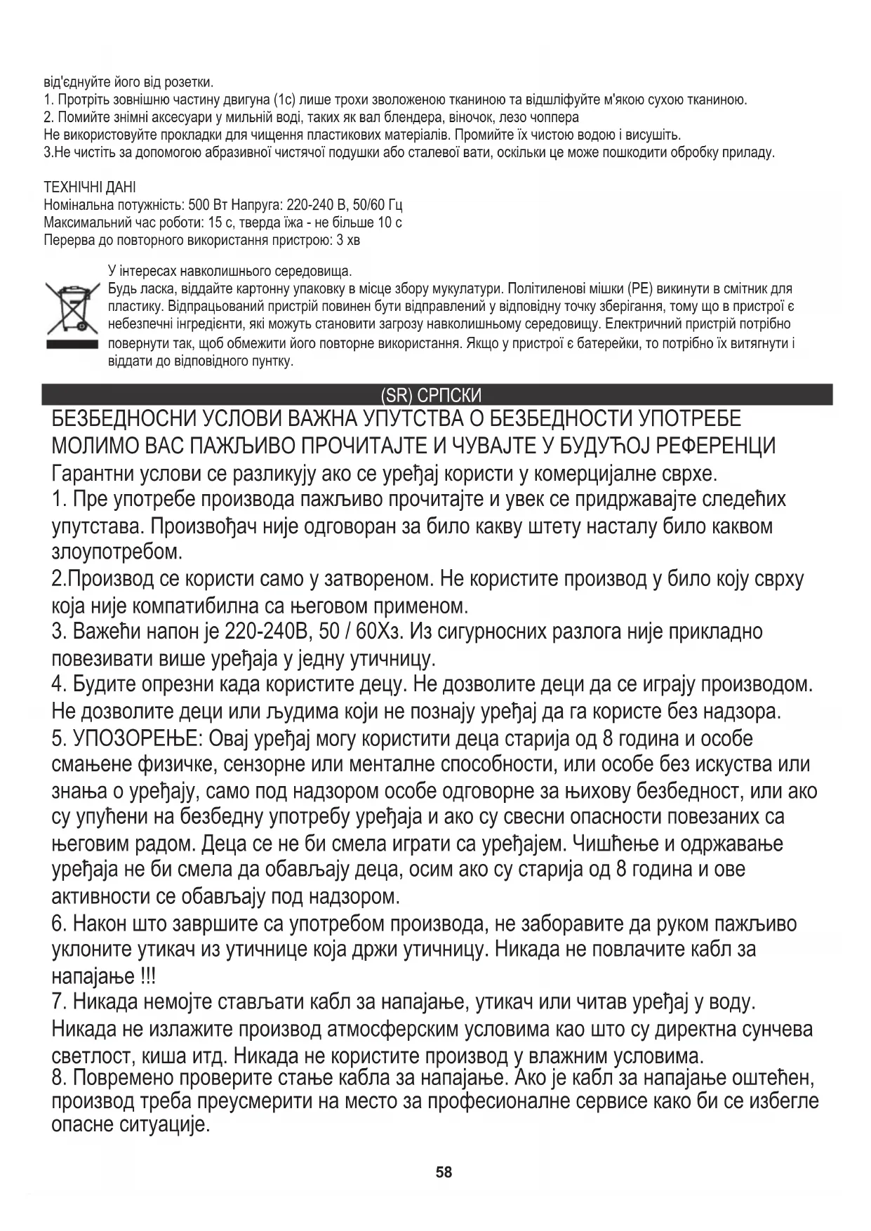 Не дозволите деци или људима који не познају уређај да га користе без надзора. У інтересах навколишнього середовища. Будь ласка, віддайте картонну упаковку в місце збору мукулатури. Політиленові мішки (PE) викинути в смітник для пластику. Відпрацьований пристрій повинен бути відправлений у відповідну точку зберігання, тому що в пристрої є небезпечні інгредієнти, які можуть становити загрозу навколишньому середовищу. Електричний пристрій потрібно повернути так, щоб обмежити його повторне використання. Якщо у пристрої є батерейки, то потрібно їх витягнути і віддати до відповідного пунтку. (SR) СРПСКИ59