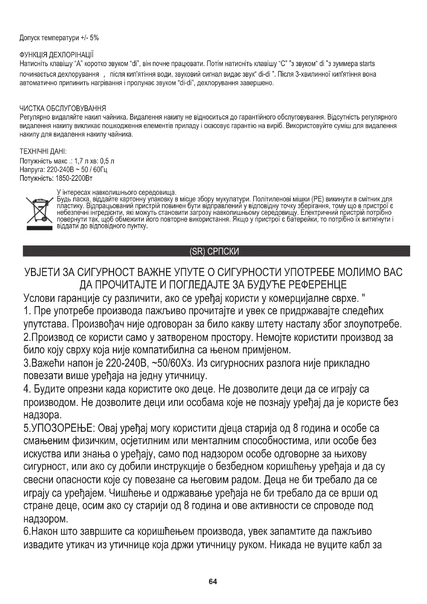 ВОДО КОТЛОВАЊЕ 60 ℃ - 90 ℃ БЕЗ ЧУВАЊА ТОПЛЕ ФУНКЦИЈЕ Кратко притисните тастер "А", са звуком "ди.", Он почиње да ради. Након што вода заври, индикатор се искључује и зујало истовремено шаље звук „ди“. Кратко притисните тастер “А”, звучни сигнал ће послати “ди” звук, чајник сада кључа. НАПРЕДНА ОПЕРАЦИЈА: ЈЕДНОКЛАЂЕЊЕ ДО 100 Притисните тастер "Б" једном / два пута / трипут / четврти пут, а индикаторска лампица је испод 60 70/70 80/80 90/90 ℃ са зеленом / плавом / жутом / љубичастом ЛЕД лампом. То значи да ће престати са грејањем када температура воде достигне 60 70/70 80/80 90/90 ℃67 КЕЕП ВАРМ ФУНЦТИОН 60 90 - 90 ℃ (Напомена: Само у таквим операцијама, функција одржавања топлоте ће бити активна. Ова функција ће бити неважећа ако се тело чајника скине са базе. ЧИШЋЕЊЕ ОДРЖАВАЊА Редовно уклањајте каменац из котла. Уклањање каменца не припада гаранцији. Недостатак редовног уклањања каменца узрокује оштећење елемената уређаја и поништава гаранцију производа. Користите смешу за уклањање каменца да бисте уклонили каменац из котла. ТЕХНИЧКИ ПОДАЦИ: Притиснути “А” на 2 секунде, са звучним сигналом шаље “ди” звук, “Б” индикаторска лампица је укључена, а апарат је у режиму загревања, са црвеним ЛЕД светлом ће се укључити. Индикаторска лампица је и даље упаљена након што вода заврши кључање, а апарат се аутоматски окреће у функцији задржавања топлоте 2 сата. Када се температура воде смањи на 85 ле, чајник поново почиње да кува до 100 и понови операцију 2 сата. Толеранција температуре +/- 5% Притиснути “А” на 2 секунде, са “ди” звуком, индикатор “Б” тастера ће светлети, а функција задржавања топлоте је активна. Притисните “Б” једном / / два пута / трипут / четврти пут, када је индикаторска лампица испод 60 ℃ / 70 80/80 90/90 ℃ са зеленом / плавом / жутом / љубичастом ЛЕД лампом. То значи да када температура воде достигне 50 60/60 70/70 80/80 ℃, она ће прокухати на 60 70/70 80/80 90/90 ℃, а функција топлотне изолације ће радити 2 сата. ФУНКЦИЈА ДЕЦХЛОРИНАТИОН Кратко притисните тастер “А” звуком “ди”, он почиње да ради. Затим притисните тастер „Ц“ са звуком „ди“ из зујалице де почиње дехлоринација , након што се вода прокуха, зујалица шаље „ди-ди“ звук. Он ће престати са грејањем аутоматски након 3 минута кључања и чуће се са звуком „ди-ди“, дехлоринација је завршена. ПОСТАВИТЕ ТОПЛУ ФУНКЦИЈУ 100 Снага: 1850-2200В Капацитет мак: 1,7л мин: 0,5л Напон: 220-240В ~ 50 / 60Хз За заштиту животне средине: молимо вас да одвојите картонске кутије и пластичне кесе и одложите их у одговарајуће канте за смеће. Коришћени уређај треба да буде испоручен на наменске сакупљане тачке због оштрих компоненти, што може утицати на животну средину. Немојте одлагати овај уређај у заједничку корпу за