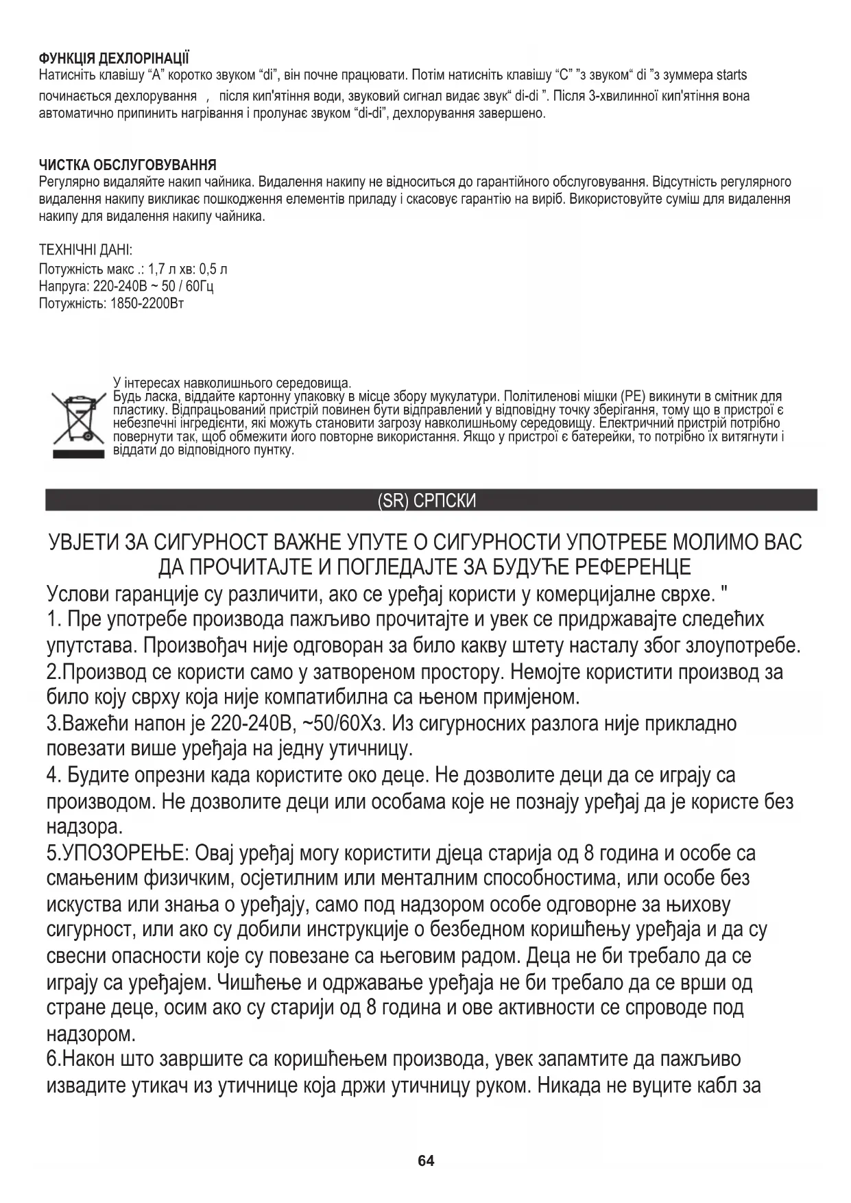 Након тога притисните “Д”, а звучни сигнал шаље звук “ди”, лампица дугмета “Д” је укључена, а чајник је у топлом режиму. Индикаторска лампица "Д" и даље светли након што вода заврши кључање и чајник аутоматски. Функцију држите топло 2 сата. Када се пребаци на температуру воде, чајник поново почне кључати на 100 ℃ и понавља рад током 2 сата. Да бисте зауставили функцију држања топло притисните тастер (А) Након тога притисните типку „Б“ једном / два пута / три пута / четврти / пети / шести / седам пута, а затим ће ЛЦД екран показати 40 ℃ / 50 ℃ / 60 ℃ / 70 ℃ / 80 ℃ / 90 ℃ То значи да ће зауставите грејање када температура воде достигне 40 ℃ / 50 ℃ / 60 ℃ / 70 ℃ / 80 ℃ / 90 ℃ Притисните типку „А“, звучни сигнал ће послати „ди“ звук, чајник ће почети да кључа, а ЛЕД (А) ће бљескати. За заустављање притисните тастер (А) Кратко притисните типку „А“, а звук „ди.“, Започиње с радом. ЛЕД (А) ће бљескати. КЕЕП ВАРМ ФУНЦТИОН 100 ℃67 Напон: 220-240В ~ 50 / 60Хз Снага: 1850-2200В Толеранција температуре +/- 5% ТЕХНИЧКИ ПОДАЦИ: Редовно уклањајте каменац из котла. Уклањање каменца не припада гаранцији. Недостатак редовног уклањања каменца узрокује оштећење елемената уређаја и поништава гаранцију производа. Користите смешу за уклањање каменца да бисте уклонили каменац из котла. Кратко притисните тастер “А” звуком “ди”, он почиње да ради. Затим притисните тастер „Ц“ са звуком „ди“ из зујалице де почиње дехлоринација , након што се вода прокуха, зујалица шаље „ди-ди“ звук. Он ће престати са грејањем аутоматски након 3 минута кључања и чуће се са звуком „ди-ди“, дехлоринација је завршена. КЕЕП ВАРМ ФУНЦТИОН 40 ℃ - 90 ℃ Затим притисните тастер "Б" +/- један / два / три / четири / пет / шест / седам пута, а затим ће индикаторска лампица показати температуру 40ºЦ / 50ºЦ / 60ºЦ / 70ºЦ / 80ºЦ / 90ºЦ / 100ºЦ. Затим притисните тастер "Д", лампица тастера "Д" светли и чајник улази у режим одржавања топлог. Индикатор "Д" ће остати упаљен након што вода заврши са кључалом и чајник ће се аутоматски пребацити на функцију држати топло током 2 сата. То значи да ће након што температура воде спусти на 30ºЦ 40ºЦ / 50ºЦ / 60ºЦ / 70ºЦ / 80ºЦ / 90ºЦ, чајник прокухати воду до температуре од 40ºЦ / 50ºЦ / 60ºЦ / 70ºЦ / 80ºЦ / 90ºЦ, и функција задржавања топлоте ће радити 2 сата. Да бисте прекинули функцију задржавања топлег притискајте дугме (А) ФУНКЦИЈА ДЕЦХЛОРИНАТИОН (Напомена: Само у таквим операцијама, функција одржавања топлоте ће бити активна. Ова функција ће бити неважећа ако се тело чајника скине са базе. ЧИШЋЕЊЕ ОДРЖАВАЊА Притисните тастер „А“, звучни сигнал ће послати „ди“ звук, чајник ће почети да кључа, ЛЕД (А) ће трептати. Капацитет мак: 1,7л мин: 0,5л За заштиту животне средине: молимо вас да одвојите картонске кутије и пластичне кесе и одложите их у одговарајуће канте за смеће. Коришћени уређај треба да буде испоручен на наменске сакупљане тачке због оштрих компоненти, што може утицати на животну средину. Немојте одлагати овај уређај у заједничку корпу за
