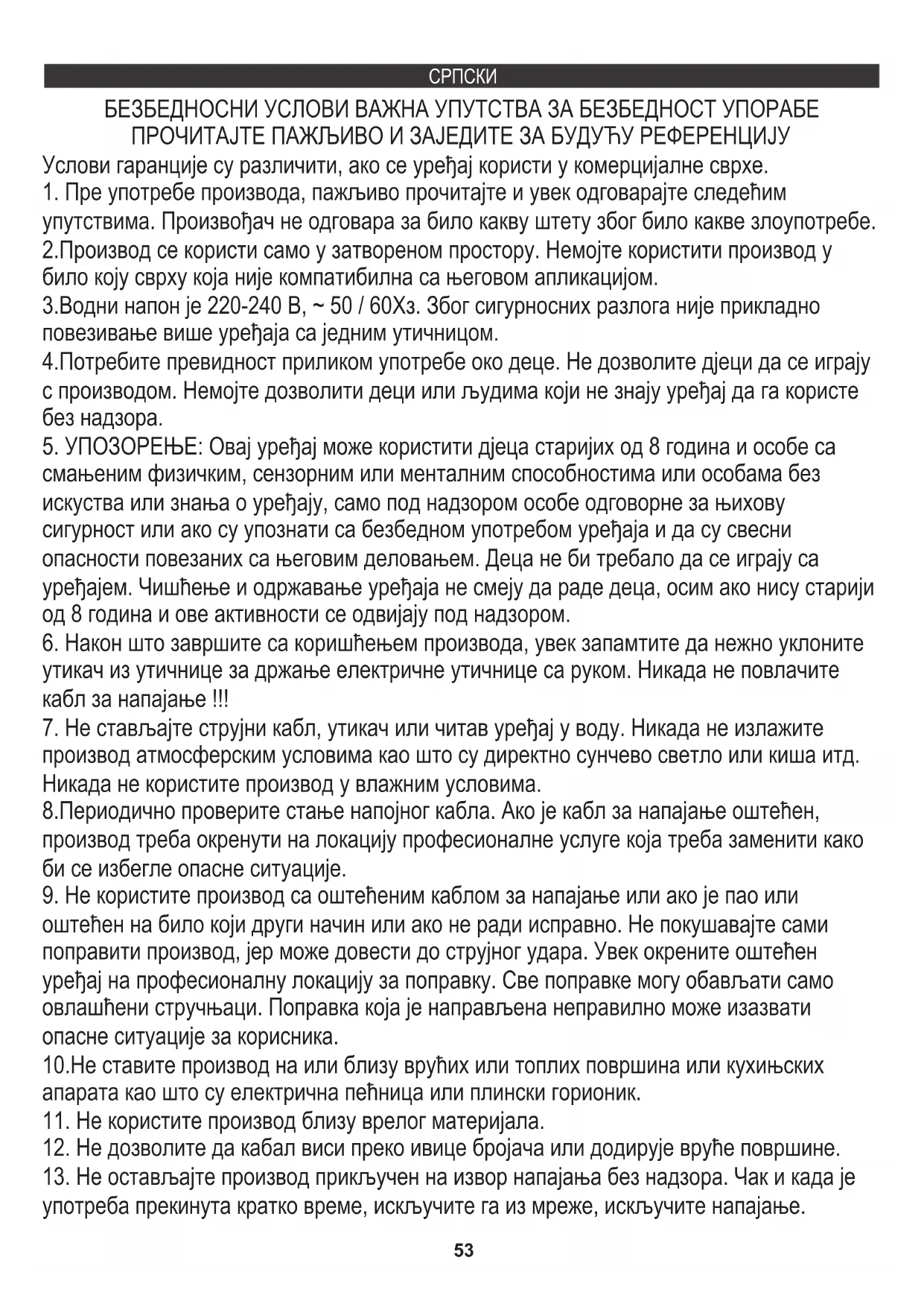 утикач из утичнице за држање електричне утичнице са руком. Никада не повлачите кабл за напајање !!! БЕЗБЕДНОСНИ УСЛОВИ ВАЖНА УПУТСТВА ЗА БЕЗБЕДНОСТ УПОРАБЕ ПРОЧИТАЈТЕ ПАЖЉИВО И ЗАЈЕДИТЕ ЗА БУДУЋУ РЕФЕРЕНЦИЈУ Услови гаранције су различити, ако се уређај користи у комерцијалне сврхе. 5318. Немојте додиривати уређај или адаптер за струју мокрим рукама.