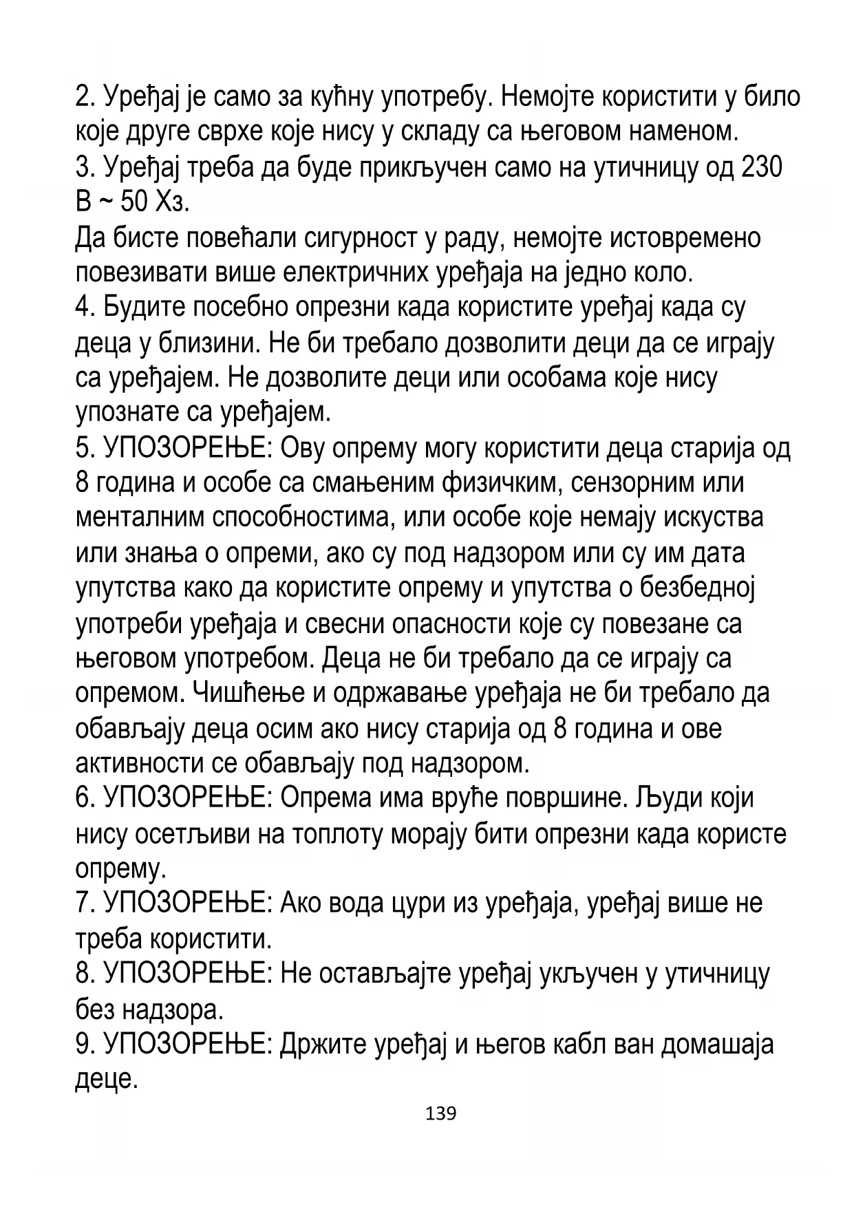 9. УПОЗОРЕЊЕ: Држите уређај и његов кабл ван домашаја