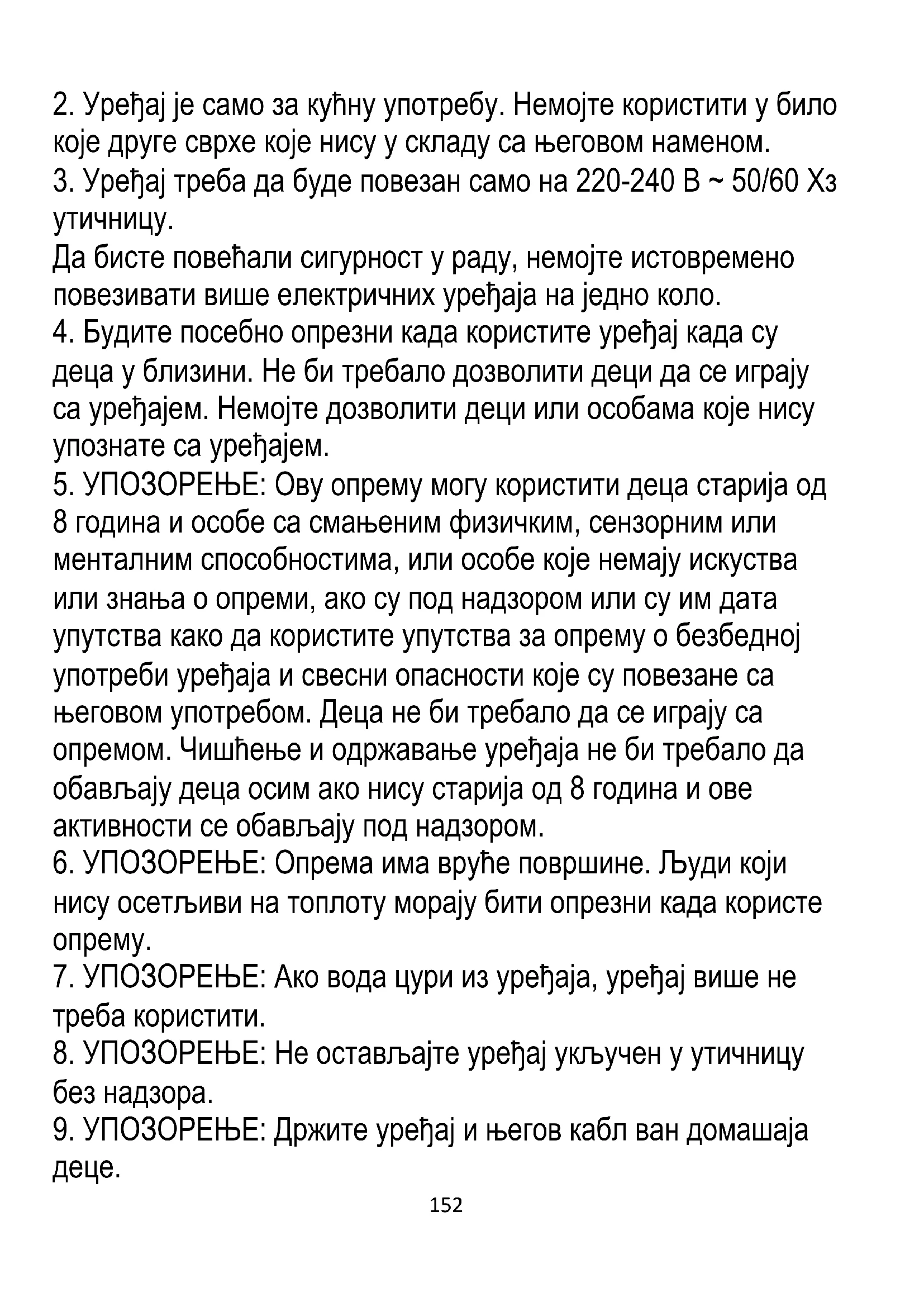 9. УПОЗОРЕЊЕ: Држите уређај и његов кабл ван домашаја