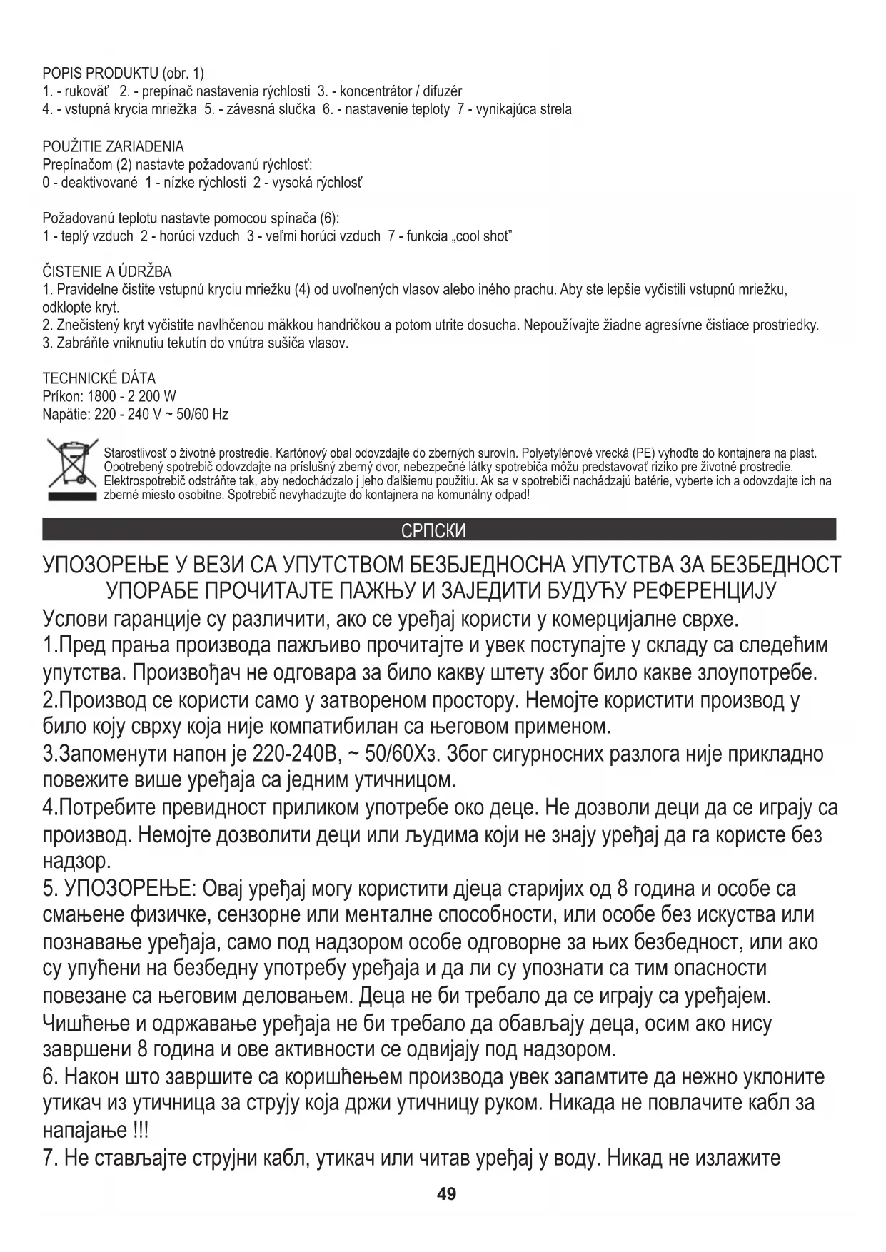 УПОЗОРЕЊЕ У ВЕЗИ СА УПУТСТВОМ БЕЗБЈЕДНОСНА УПУТСТВА ЗА БЕЗБЕДНОСТ УПОРАБЕ ПРОЧИТАЈТЕ ПАЖЊУ И ЗАЈЕДИТИ БУДУЋУ РЕФЕРЕНЦИЈУ Услови гаранције су различити, ако се уређај користи у комерцијалне сврхе. 1.Пред прања производа пажљиво прочитајте и увек поступајте у складу са следећим упутства. Произвођач не одговара за било какву штету због било какве злоупотребе. 2.Производ се користи само у затвореном простору. Немојте користити производ у било коју сврху која није компатибилан са његовом применом. 3.Запоменути напон је 220-240В, ~ 50/60Хз. Због сигурносних разлога није прикладно повежите више уређаја са једним утичницом. 4.Потребите превидност приликом употребе око деце. Не дозволи деци да се играју са производ. Немојте дозволити деци или људима који не знају уређај да га користе без