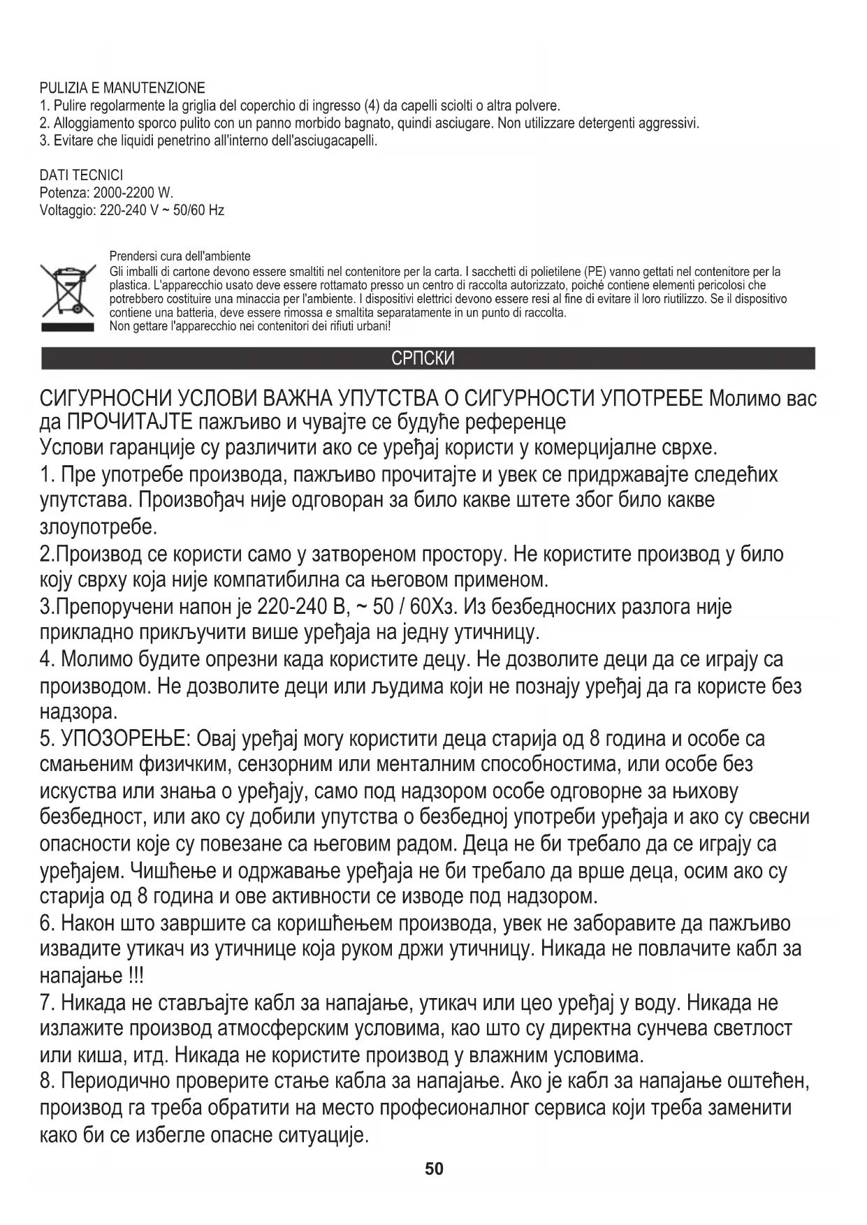 ТЕХНИЧКИ ПОДАЦИ Снага: 2000-2200В Напон: 220-240В ~ 50 / 60Хз За заштиту животне средине: молимо вас да одвојите картонске кутије и пластичне кесе и одложите их у одговарајуће канте за смеће. Коришћени уређај треба да буде испоручен на наменске сакупљане тачке због оштрих компоненти, што може утицати на животну средину. Немојте одлагати овај уређај у заједничку корпу за отпатке. (DK) brugsanvisning DANSKI