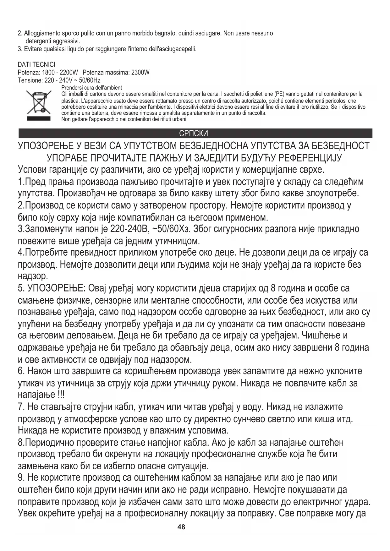 DATI TECNICI Potenza: 1800 - 2200W Potenza massima: 2300W УПОЗОРЕЊЕ У ВЕЗИ СА УПУТСТВОМ БЕЗБЈЕДНОСНА УПУТСТВА ЗА БЕЗБЕДНОСТ УПОРАБЕ ПРОЧИТАЈТЕ ПАЖЊУ И ЗАЈЕДИТИ БУДУЋУ РЕФЕРЕНЦИЈУ Услови гаранције су различити, ако се уређај користи у комерцијалне сврхе. 1.Пред прања производа пажљиво прочитајте и увек поступајте у складу са следећим упутства. Произвођач не одговара за било какву штету због било какве злоупотребе. 2.Производ се користи само у затвореном простору. Немојте користити производ у било коју сврху која није компатибилан са његовом применом. 3.Запоменути напон је 220-240В, ~50/60Хз. Због сигурносних разлога није прикладно повежите више уређаја са једним утичницом. 4.Потребите превидност приликом употребе око деце. Не дозволи деци да се играју са производ. Немојте дозволити деци или људима који не знају уређај да га користе без
