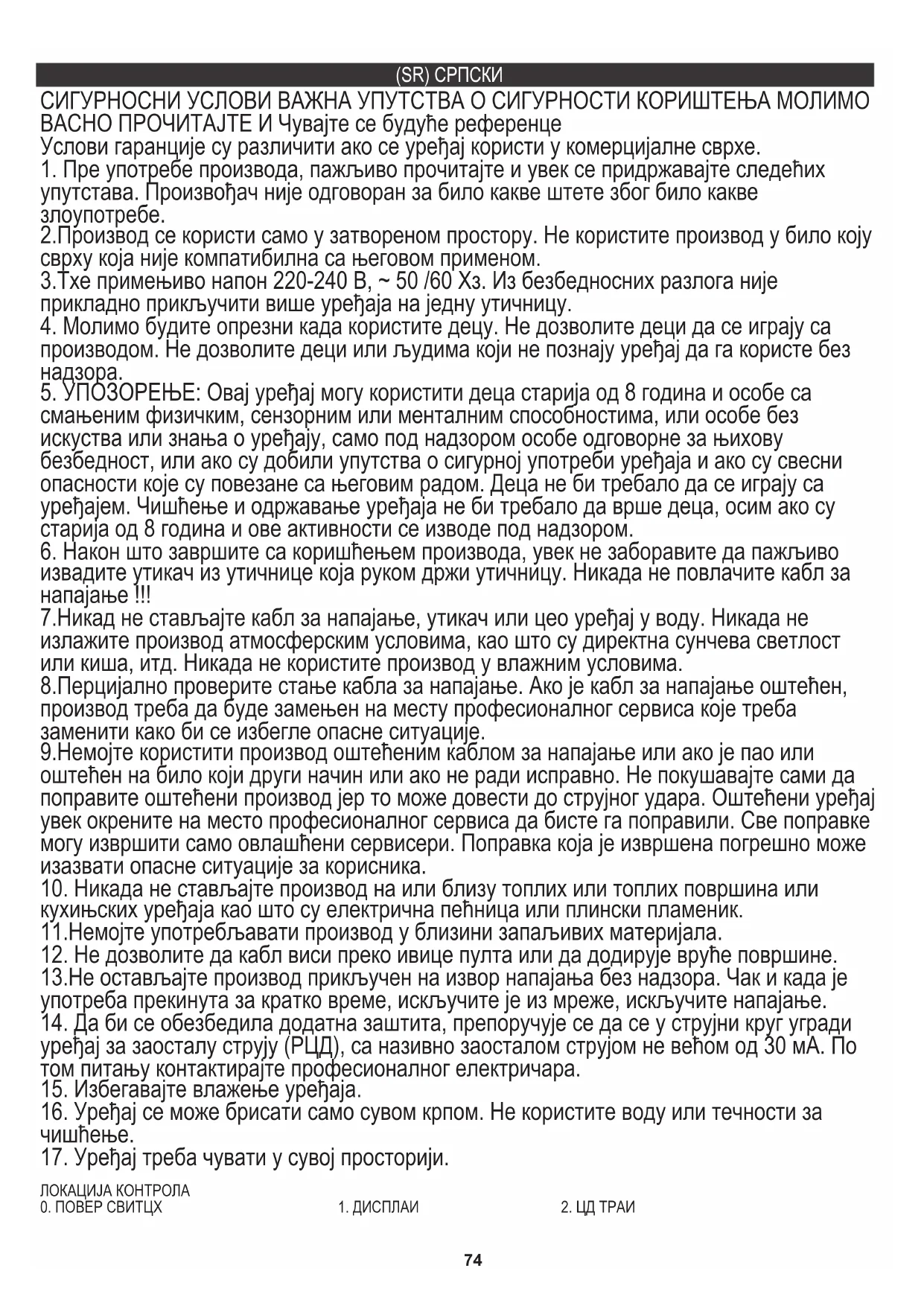 16. Уређај се може брисати само сувом крпом. Не користите воду или течности за