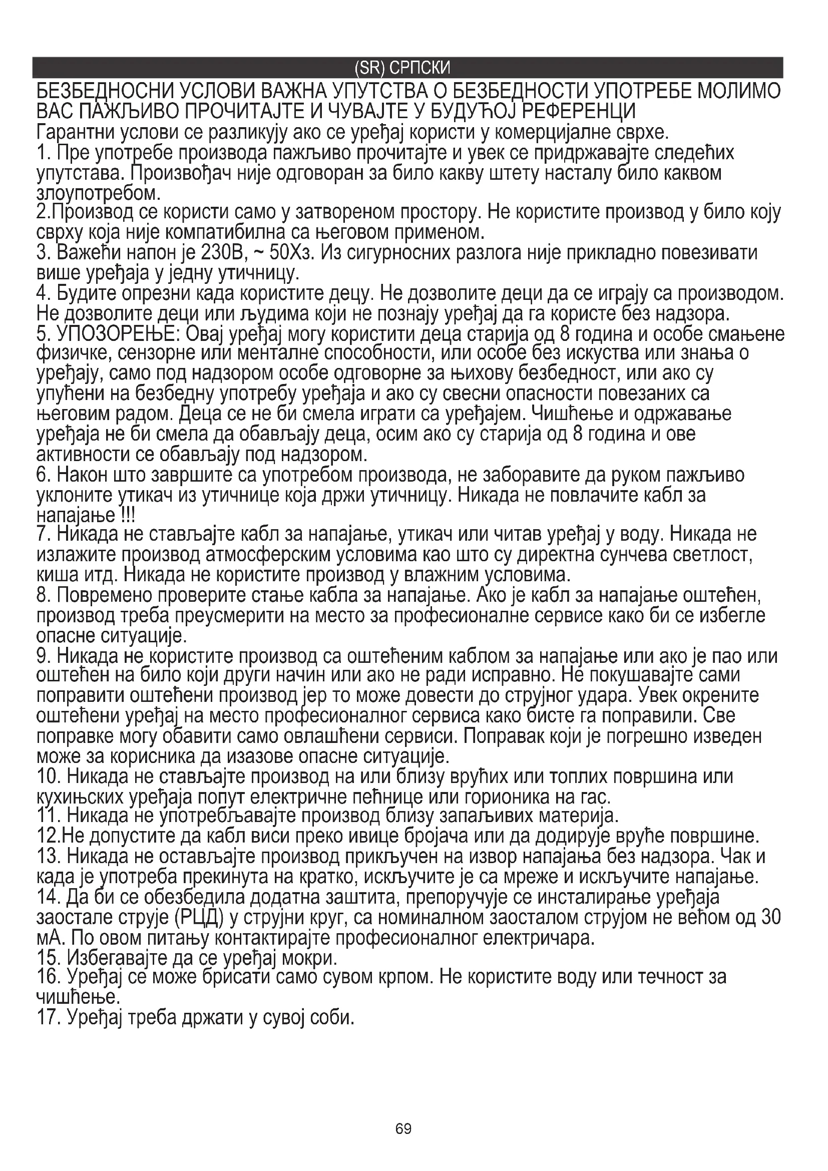 17. Уређај треба држати у сувој соби.70