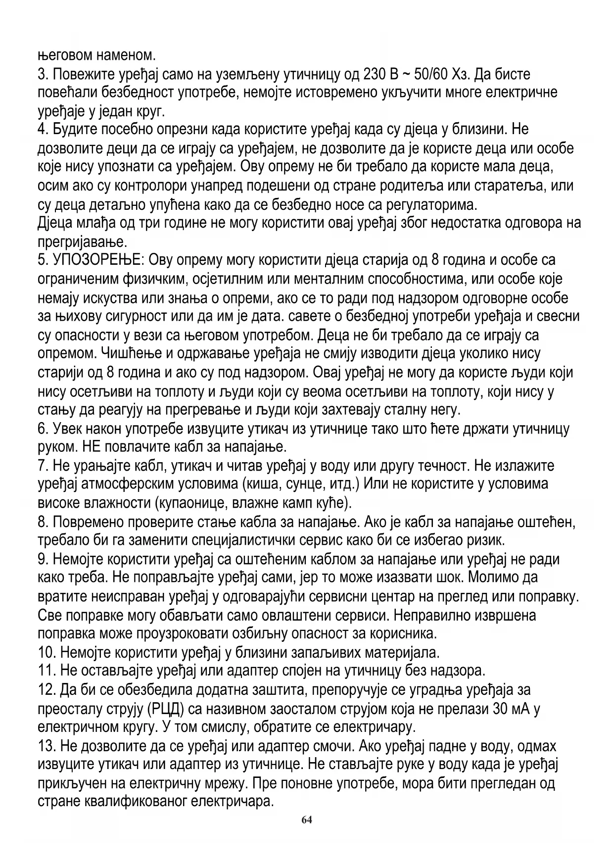 ограниченим физичким, осјетилним или менталним способностима, или особе које немају искуства или знања о опреми, ако се то ради под надзором одговорне особе за њихову сигурност или да им је дата. савете о безбедној употреби уређаја и свесни су опасности у вези са његовом употребом. Деца не би требало да се играју са опремом. Чишћење и одржавање уређаја не смију изводити дјеца уколико нису старији од 8 година и ако су под надзором. Овај уређај не могу да користе људи који нису осетљиви на топлоту и људи који су веома осетљиви на топлоту, који нису у стању да реагују на прегревање и људи који захтевају сталну негу.