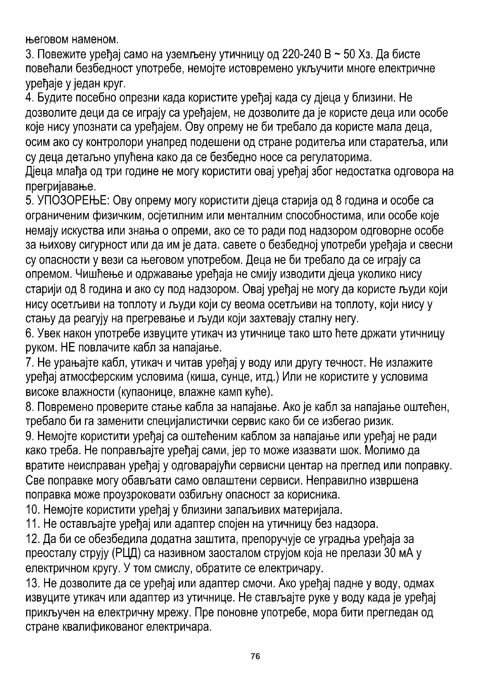 ограниченим физичким, осјетилним или менталним способностима, или особе које немају искуства или знања о опреми, ако се то ради под надзором одговорне особе за њихову сигурност или да им је дата. савете о безбедној употреби уређаја и свесни су опасности у вези са његовом употребом. Деца не би требало да се играју са опремом. Чишћење и одржавање уређаја не смију изводити дјеца уколико нису старији од 8 година и ако су под надзором. Овај уређај не могу да користе људи који нису осетљиви на топлоту и људи који су веома осетљиви на топлоту, који нису у стању да реагују на прегревање и људи који захтевају сталну негу.
