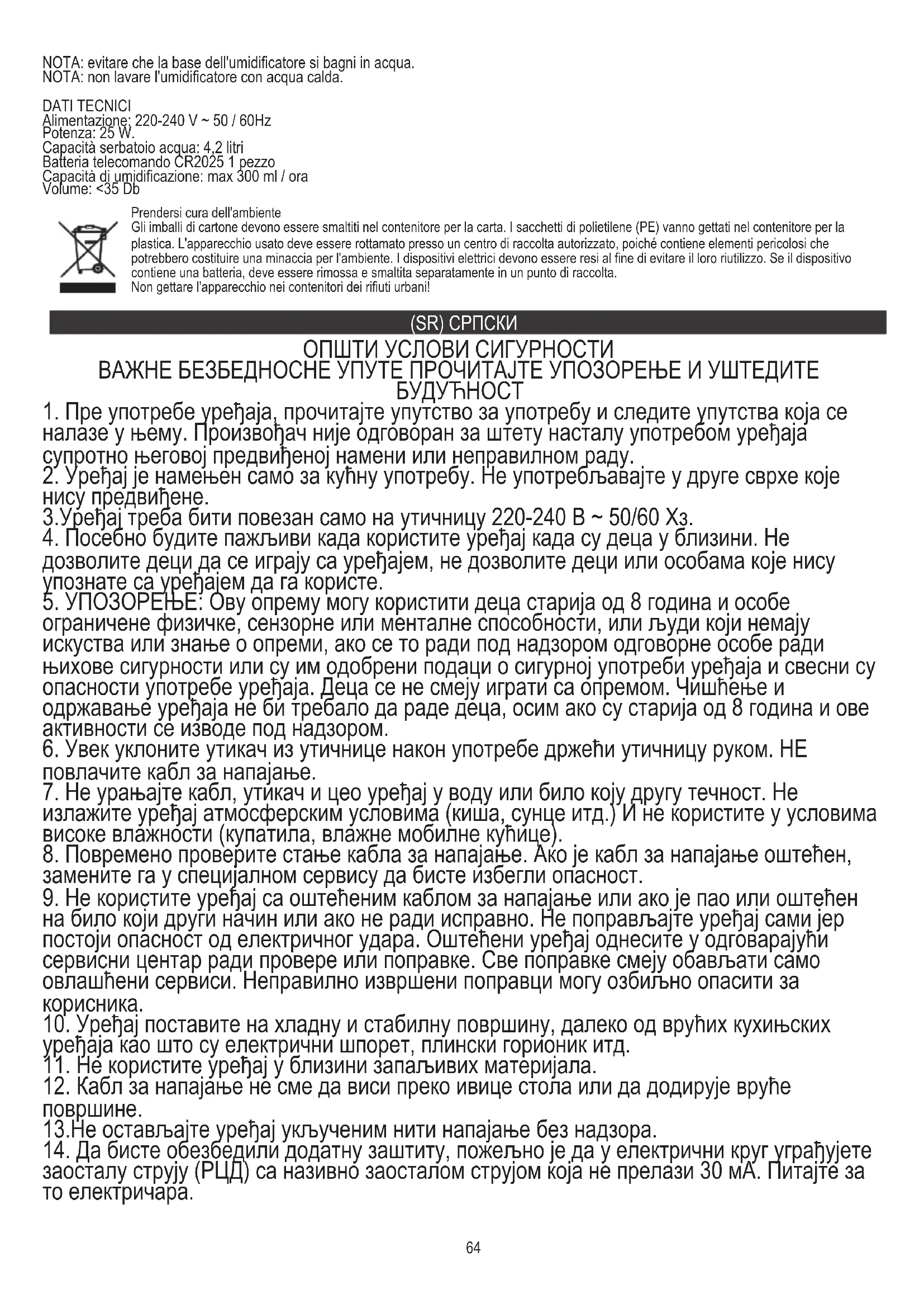 5. Замените филтер за уклањање каменца воде сваке 1-2 године. Филтер је прљав и треба га заменити када постане беле боје. НАПОМЕНА: Не дозволите да се база овлаживача овлажи у води. НАПОМЕНА: Не умивајте овлаживач топлом водом. ТЕХНИЧКИ ПОДАЦИ Напајање: 220-240В ~ 50 / 60Хз Снага: 25 В Капацитет резервоара за воду: 4,2 литра Даљински управљач батерије ЦР2025 1 ком Капацитет влажења: мак 300 мл / сат Запремина: <35 Дб За заштиту животне средине: молимо вас да одвојите картонске кутије и пластичне кесе и одложите их у одговарајуће канте за смеће. Коришћени уређај треба да буде испоручен на наменске сакупљане тачке због оштрих компоненти, што може утицати на животну средину. Немојте одлагати овај уређај у заједничку корпу за отпатке.67 (DK) DANSKI GENERELLE SIKKERHEDSBETINGELSER VIGTIGE SIKKERHEDSINSTRUKTIONER LÆS PERSONLIG OG SPAR FOR FREMTID