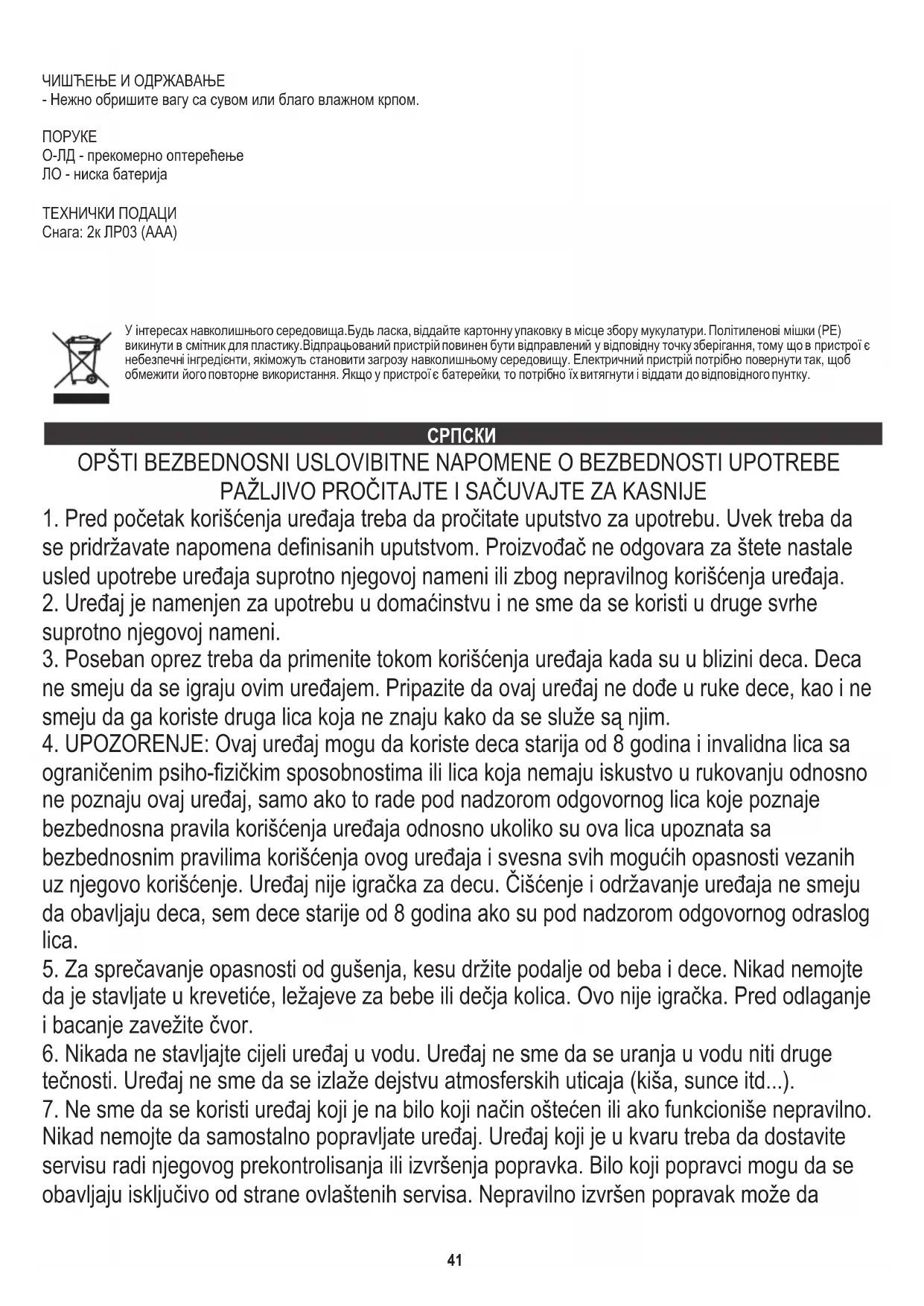 Скините поклопац одељка за батерију на дну скале. Уклоните стару батерију. Убаците нову батерију одговарајућег типа. Затворите поклопац одељка за батерију. О-ЛД - прекомерно оптерећење Притисните тастер ОН / ОФФ (4) да бисте укључили вагу. Сачекајте да скала приказује вредност 0.0 и нула симбол. - Нежно обришите вагу са сувом или благо влажном крпом. ЧИШЋЕЊЕ И ОДРЖАВАЊЕ ЛО - ниска батерија ТЕХНИЧКИ ПОДАЦИ Снага: 2к ЛР03 (ААА) Резултат вагања ће се приказати 20 секунди. ВЕШАЊЕ ДЕТЕТА