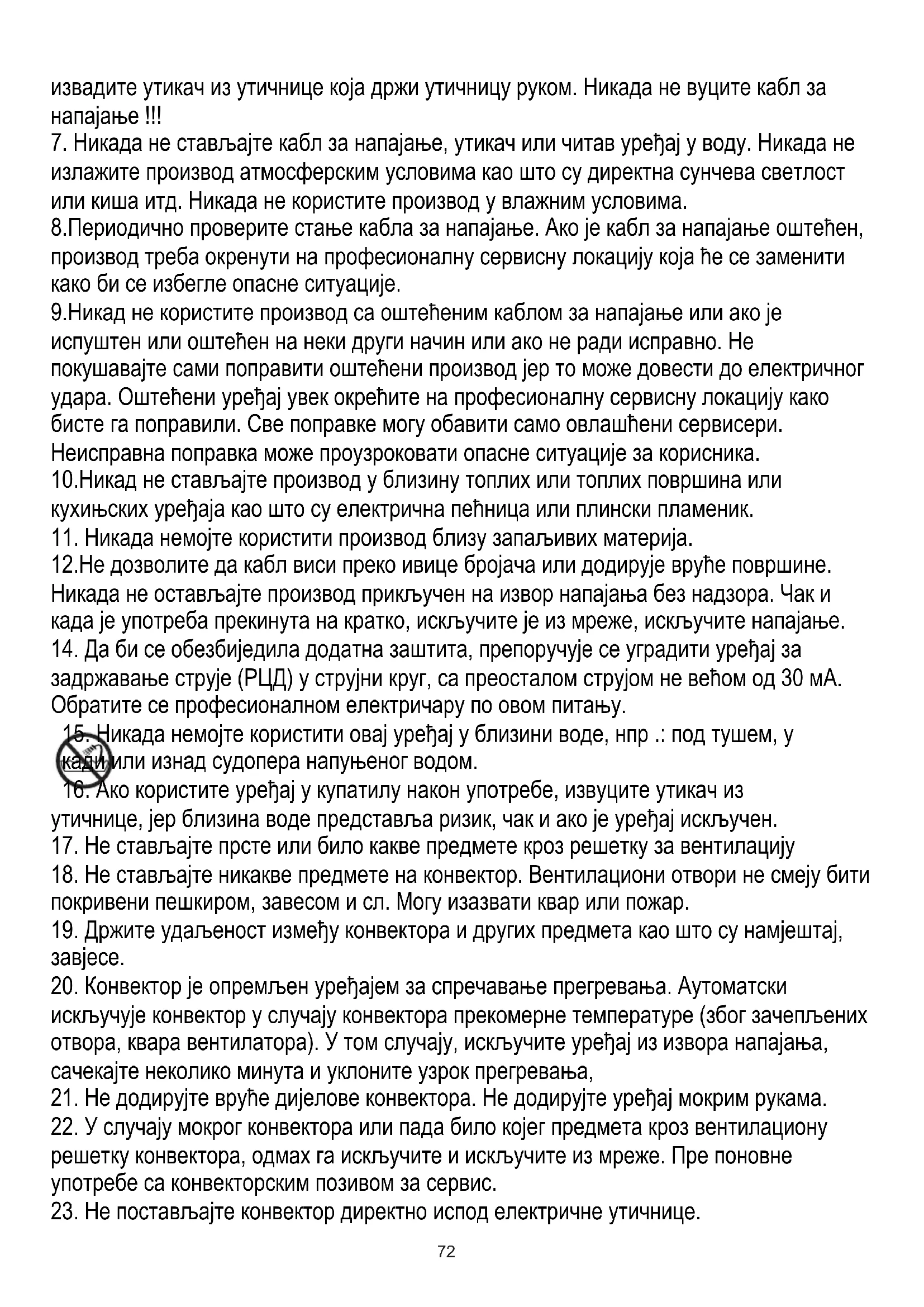 18. Не стављајте никакве предмете на конвектор. Вентилациони отвори не смеју бити