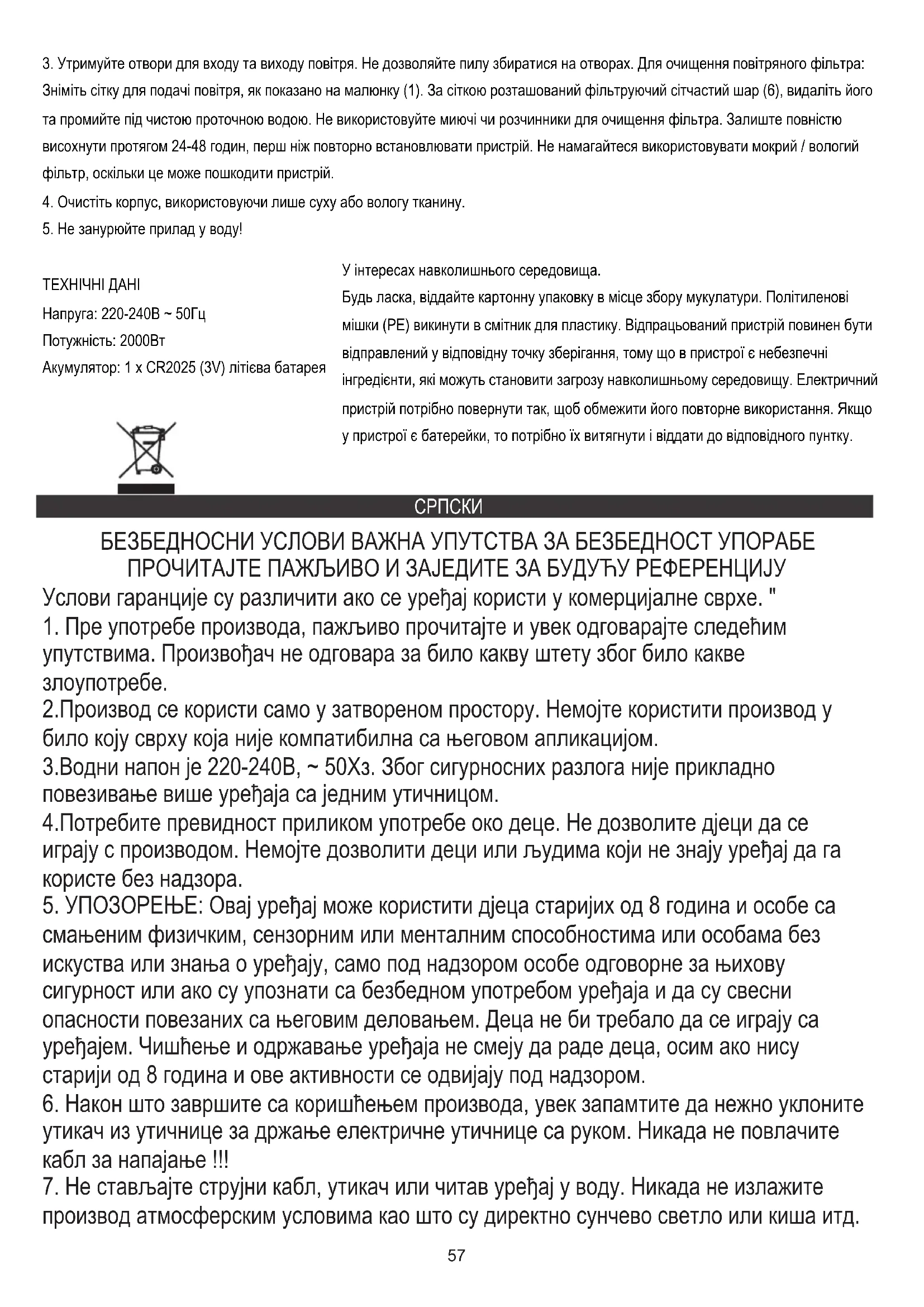 ТЕХНИЧКИ ПОДАЦИ Напон: 220-240В ~ 50Хз Снага: 2000В Батерија: 1 к ЦР2025 (3В) литијумска