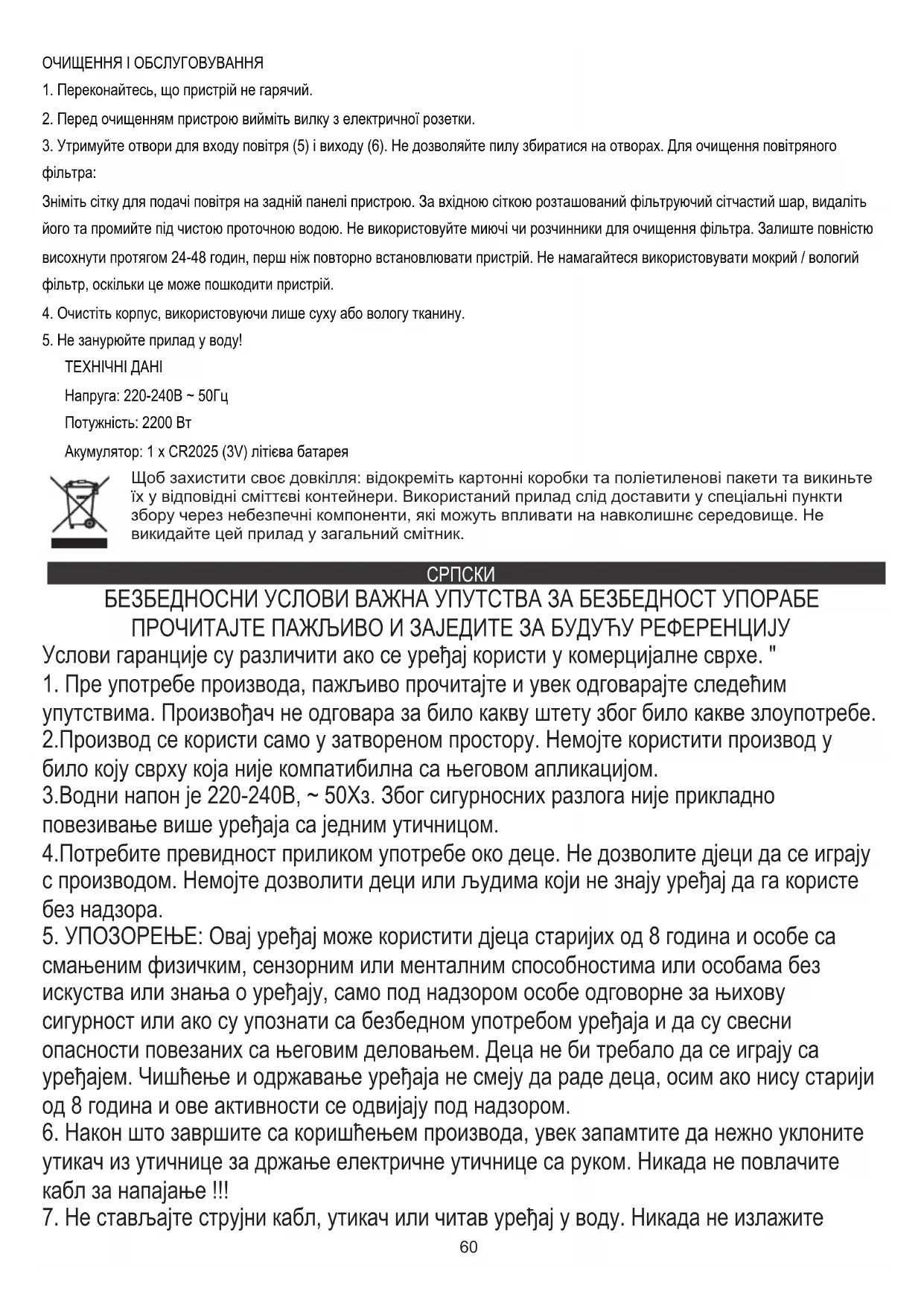 ТЕХНИЧКИ ПОДАЦИ Напон: 220-240В ~ 50Хз Снага: 2200В Батерија: 1 к CR2025 (3В) литијумска батерија За заштиту животне средине: молимо вас да одвојите картонске кутије и пластичне кесе и одложите их у одговарајуће канте за смеће. Коришћени уређај треба да буде испоручен на наменске сакупљане тачке због оштрих компоненти, што може утицати на животну средину. Немојте одлагати овај уређај у заједничку корпу за отпатке. SVENSKA SÄKERHETSVILLKOR VIKTIGA INSTRUKTIONER FÖR ANVÄNDNINGSÄKERHET LÄS SÄKERHET LÄCKLIGT OCH HÅLL FÖR FRAMTIDA REFERENS Garantivillkoren är olika, om enheten används för kommersiellt ändamål. "64