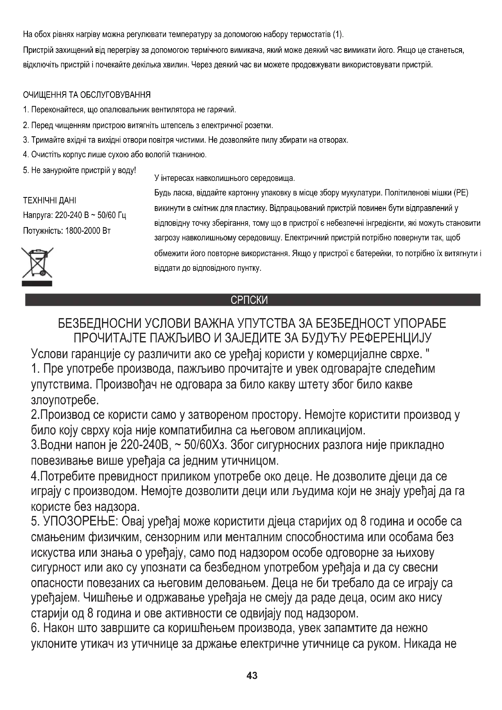 ТЕХНИЧКИ ПОДАЦИ Напон: 220-240В ~ 50/60Хз Снага: 1800-2000В За заштиту животне средине: молимо вас да одвојите картонске кутије и пластичне кесе и одложите их у одговарајуће канте за смеће. Коришћени уређај треба да буде испоручен на наменске сакупљане тачке због оштрих компоненти, што може утицати на животну средину. Немојте одлагати овај уређај у заједничку корпу за отпатке. SVENSKA SÄKERHETSVILLKOR VIKTIGA INSTRUKTIONER FÖR ANVÄNDNINGSÄKERHET LÄS SÄKERHET LÄCKLIGT OCH HÅLL FÖR FRAMTIDA REFERENS Garantivillkoren är olika, om enheten används för kommersiellt ändamål. "