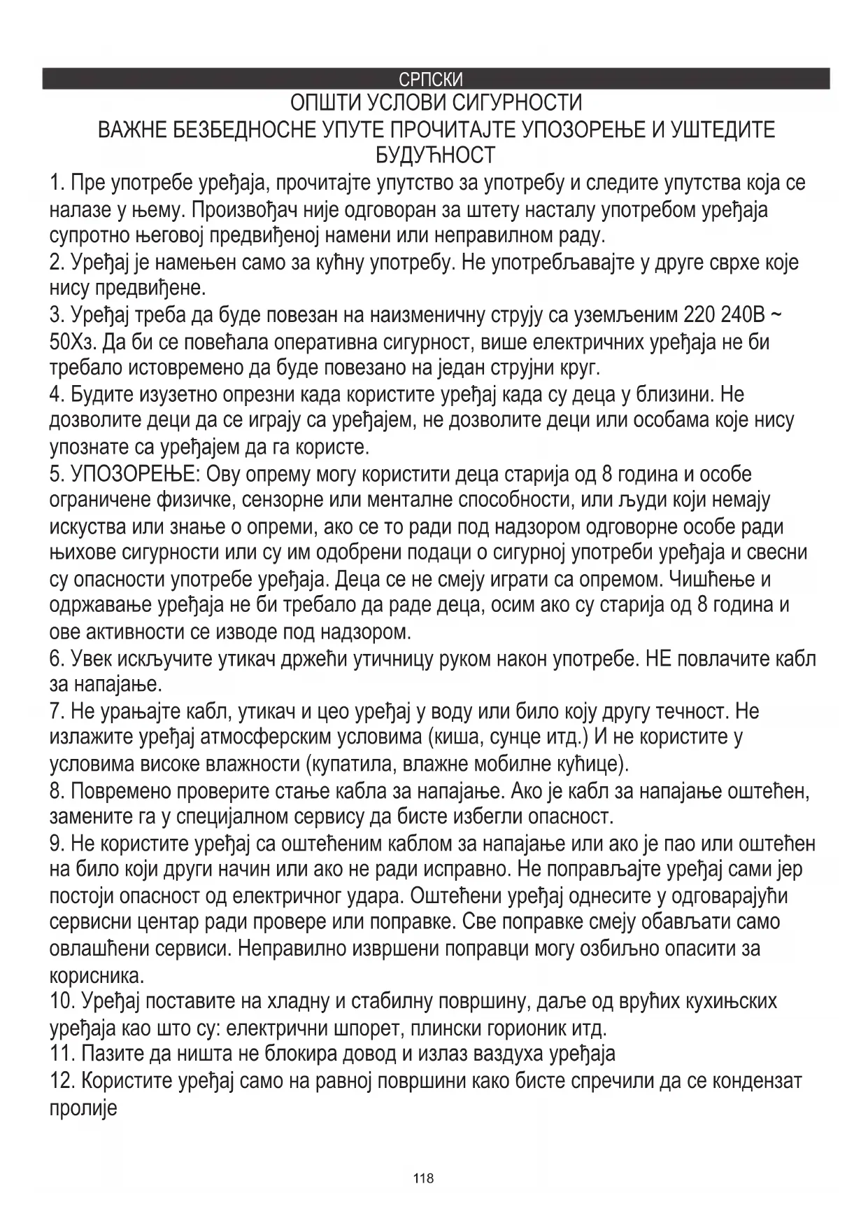 налазе у њему. Произвођач није одговоран за штету насталу употребом уређаја супротно његовој предвиђеној намени или неправилном раду. ОПШТИ УСЛОВИ СИГУРНОСТИ