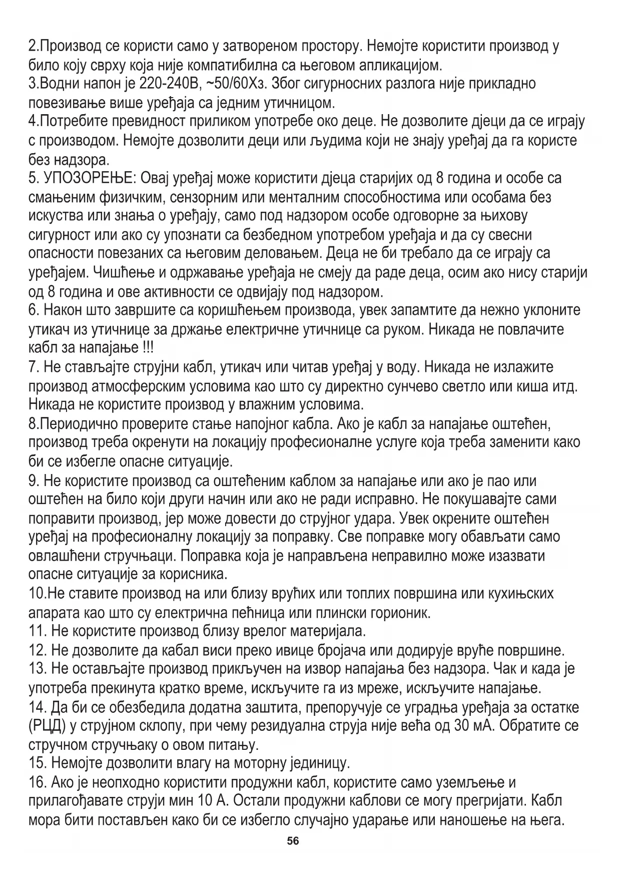 смањеним физичким, сензорним или менталним способностима или особама без искуства или знања о уређају, само под надзором особе одговорне за њихову сигурност или ако су упознати са безбедном употребом уређаја и да су свесни опасности повезаних са његовим деловањем. Деца не би требало да се играју са уређајем. Чишћење и одржавање уређаја не смеју да раде деца, осим ако нису старији од 8 година и ове активности се одвијају под надзором. 8.Периодично проверите стање напојног кабла. Ако је кабл за напајање оштећен, производ треба окренути на локацију професионалне услуге која треба заменити како би се избегле опасне ситуације.