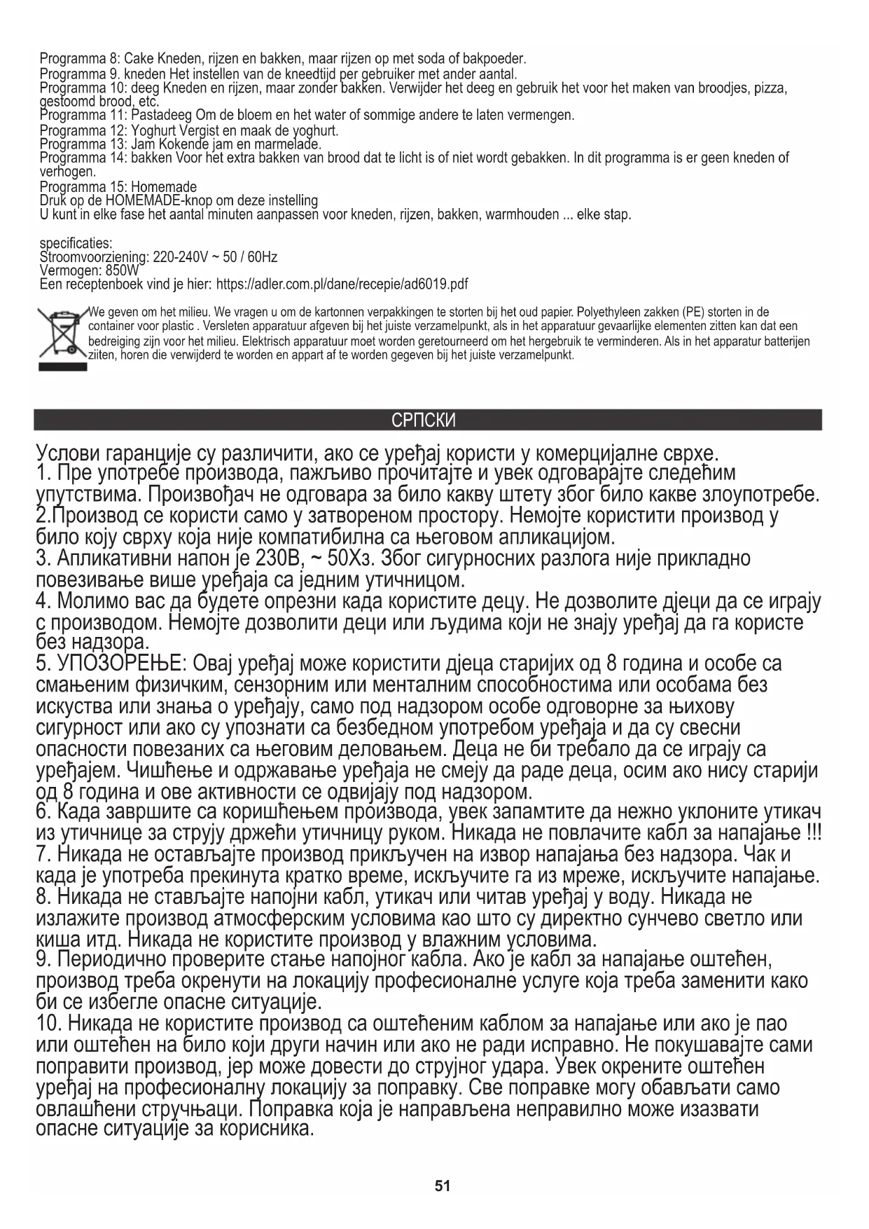 Програм 11: тесто за тестенине Да би брашно и вода или неки други успели да комбинују. Програм 12: Јогурт Фермент и направите јогурт. Програм 13: Заглављени џемови и мармелада. Програм 14: Печење За додатну печење хлеба који су превише лагани или не пече. У овом програму нема гњечења или подизања. Програм 15: Домаћи Притисните дугме ХОМЕМАДЕ Можете прилагодити колико минута у свакој фази за гњечење, подизање, печење, одржавање топлог ... сваки корак. Спецификације: Напајање: 220-240В ~ 50 / 60Хз Снага: 850В Књигу рецепата можете пронаћи овде: https://adler.com.pl/dane/recepie/ad6019.pdf Garantibetingelserne er forskellige, hvis enheden bruges til kommercielt formål.
