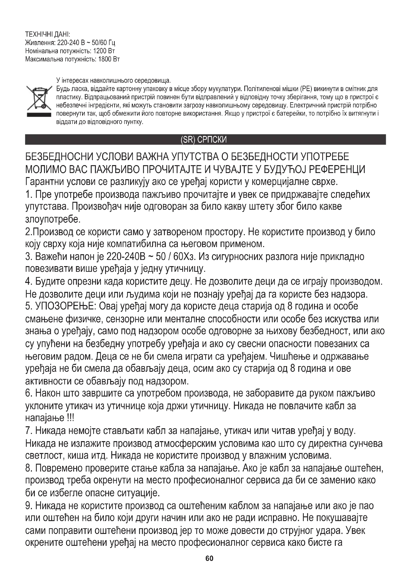 Напајање: 220-240В ~ 50 / 60Хз ТЕХНИЧКИ ПОДАЦИ: Максимална снага: 1800В Номинална снага: 1200В За заштиту животне средине: молимо вас да одвојите картонске кутије и пластичне кесе и одложите их у одговарајуће канте за смеће. Коришћени уређај треба да буде испоручен на наменске сакупљане тачке због оштрих компоненти, што може утицати на животну средину. Немојте одлагати овај уређај у заједничку корпу за