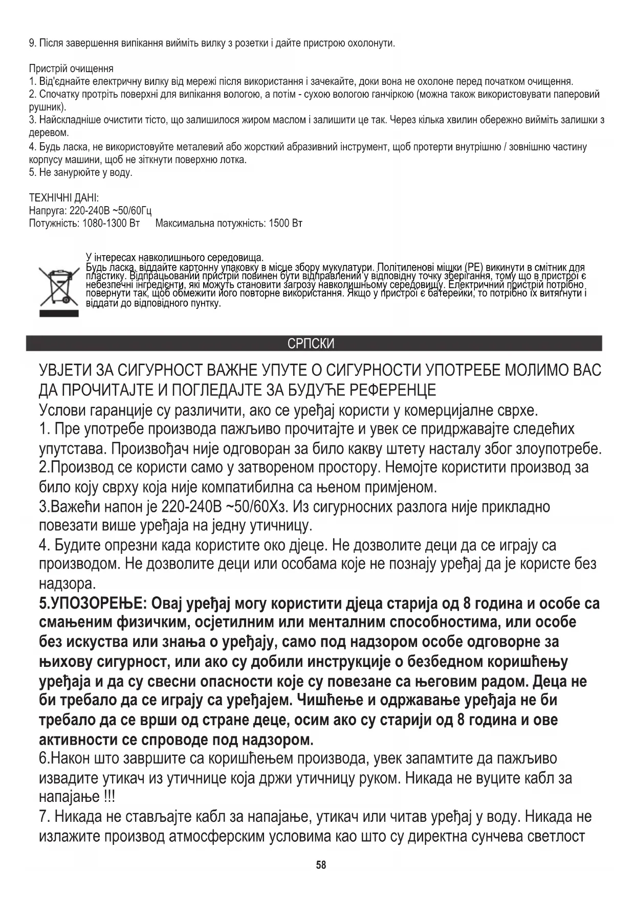 Потужність: 1080-1300 Вт Максимальна потужність: 1500 Вт Напруга: 220-240В ~50/60Гц ТЕХНІЧНІ ДАНІ: У інтересах навколишнього середовища. Будь ласка, віддайте картонну упаковку в місце збору мукулатури. Політиленові мішки (PE) викинути в смітник для пластику. Відпрацьований пристрій повинен бути відправлений у відповідну точку зберігання, тому що в пристрої є небезпечні інгредієнти, які можуть становити загрозу навколишньому середовищу. Електричний пристрій потрібно повернути так, щоб обмежити його повторне використання. Якщо у пристрої є батерейки, то потрібно їх витягнути і віддати до відповідного пунтку. 6.Након што завршите са коришћењем производа, увек запамтите да пажљиво извадите утикач из утичнице која држи утичницу руком. Никада не вуците кабл за напајање !!! 5.УПОЗОРЕЊЕ: Овај уређај могу користити дјеца старија од 8 година и особе са смањеним физичким, осјетилним или менталним способностима, или особе без искуства или знања о уређају, само под надзором особе одговорне за њихову сигурност, или ако су добили инструкције о безбедном коришћењу уређаја и да су свесни опасности које су повезане са његовим радом. Деца не би требало да се играју са уређајем. Чишћење и одржавање уређаја не би требало да се врши од стране деце, осим ако су старији од 8 година и ове активности се спроводе под надзором. 3.Важећи напон је 220-240В ~50/60Хз. Из сигурносних разлога није прикладно повезати више уређаја на једну утичницу. УВЈЕТИ ЗА СИГУРНОСТ ВАЖНЕ УПУТЕ О СИГУРНОСТИ УПОТРЕБЕ МОЛИМО ВАС ДА ПРОЧИТАЈТЕ И ПОГЛЕДАЈТЕ ЗА БУДУЋЕ РЕФЕРЕНЦЕ 2.Производ се користи само у затвореном простору. Немојте користити производ за било коју сврху која није компатибилна са њеном примјеном.