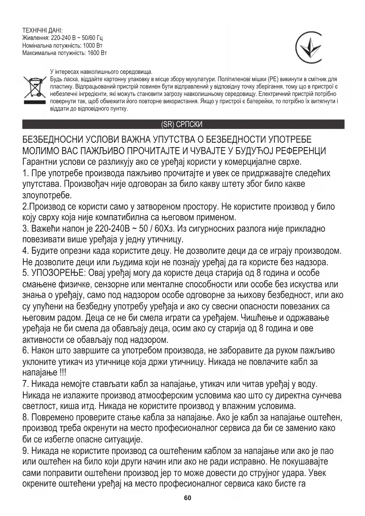 испуштати мало дима. То је нормално. За заштиту животне средине: молимо вас да одвојите картонске кутије и пластичне кесе и одложите их у одговарајуће канте за смеће. Коришћени уређај треба да буде испоручен на наменске сакупљане тачке због оштрих компоненти, што може утицати на животну средину. Немојте одлагати овај уређај у заједничку корпу за