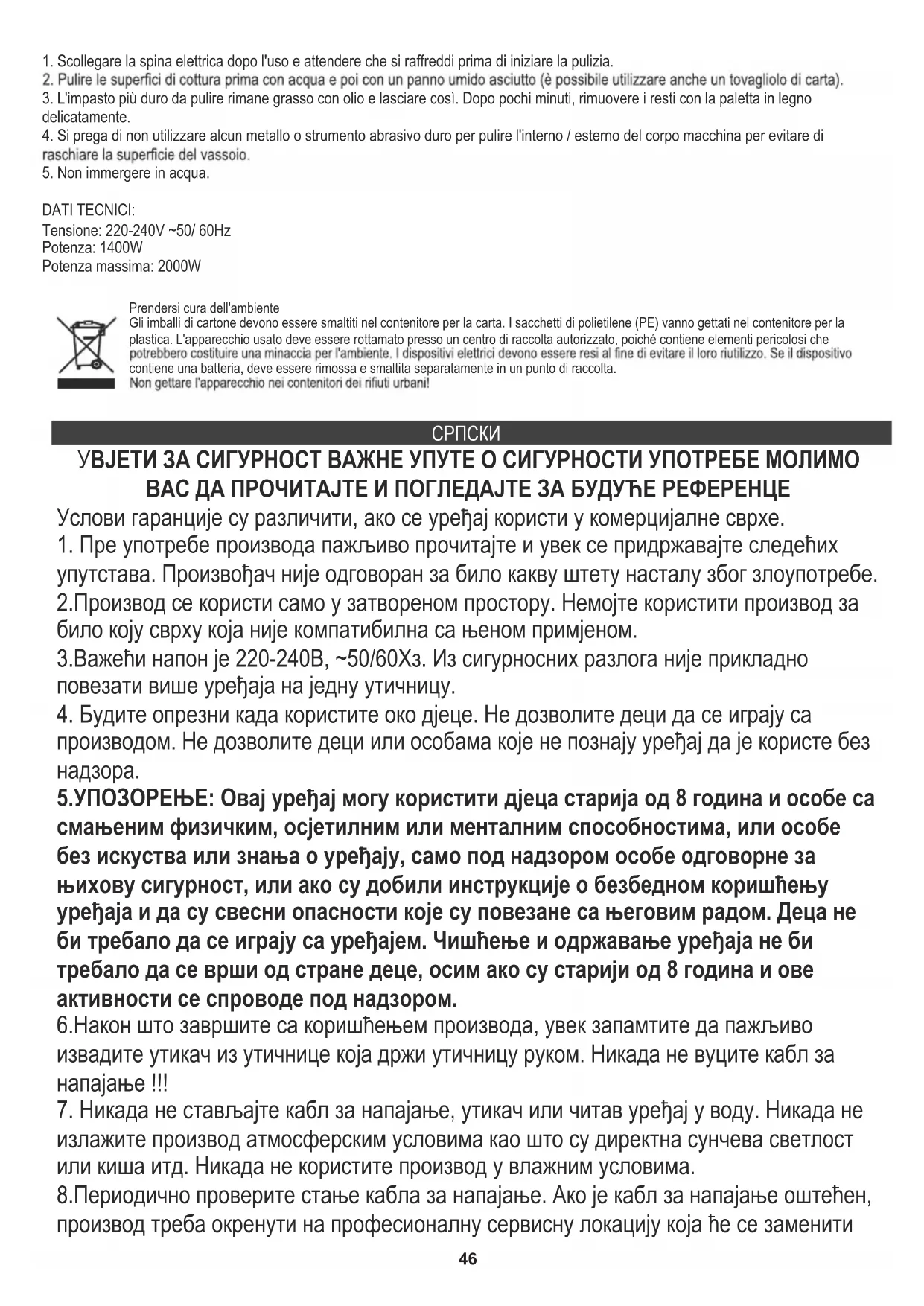 ТЕХНИЧКИ ПОДАЦИ: Напон: 220-240В ~50/60Хз Снага: 1400В Максимална снага: 2000В За заштиту животне средине: молимо вас да одвојите картонске кутије и пластичне кесе и одложите их у одговарајуће канте за смеће. Коришћени уређај треба да буде испоручен на наменске сакупљане тачке због оштрих компоненти, што може утицати на животну средину. Немојте одлагати овај уређај у заједничку корпу за