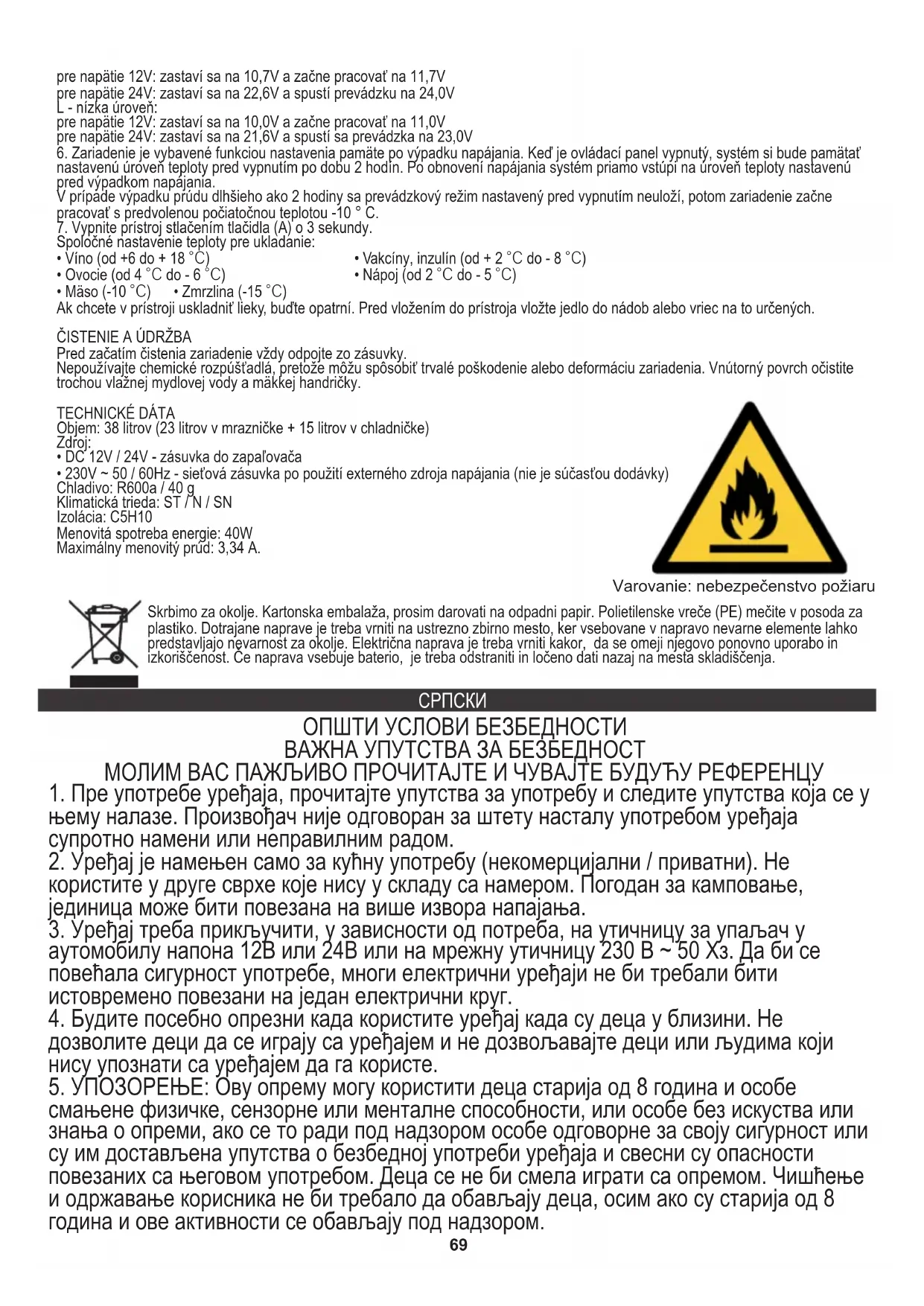 смањене физичке, сензорне или менталне способности, или особе без искуства или знања о опреми, ако се то ради под надзором особе одговорне за своју сигурност или су им достављена упутства о безбедној употреби уређаја и свесни су опасности повезаних са његовом употребом. Деца се не би смела играти са опремом. Чишћење и одржавање корисника не би требало да обављају деца, осим ако су старија од 8 година и ове активности се обављају под надзором. Varovanie: nebezpečenstvo požiaru70