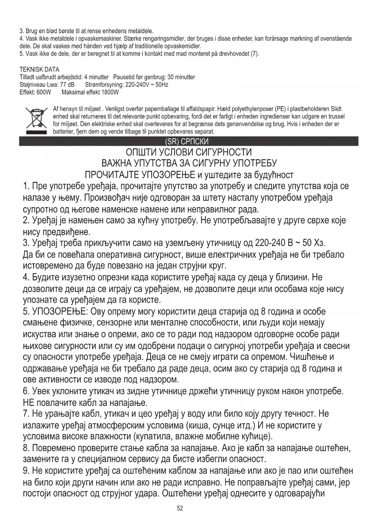 овај режим када је пуж (8) имобилизован ненамјерним млевењем меса комадима кости. ЧИШЋЕЊЕ И ОДРЖАВАЊЕ ТЕХНИЧКИ ПОДАЦИ Снага: 600В Максимална снага 1800В