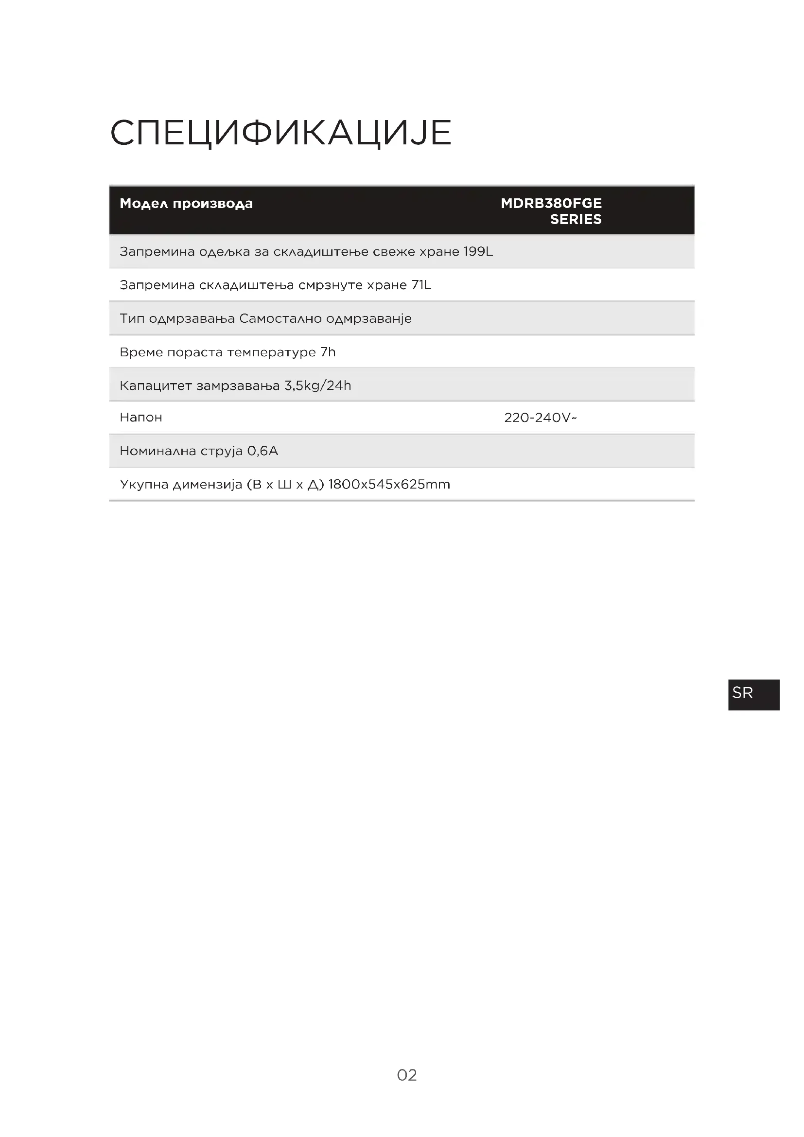 СПЕЦИФИКАЦИЈЕ Модел производа Запремина одељка за складиштење свеже хране 199L Запремина складиштења смрзнуте хране 71L Тип одмрзавања Самостално одмрзаванје Време пораста температуре 7h Капацитет замрзавања 3,5kg/24h