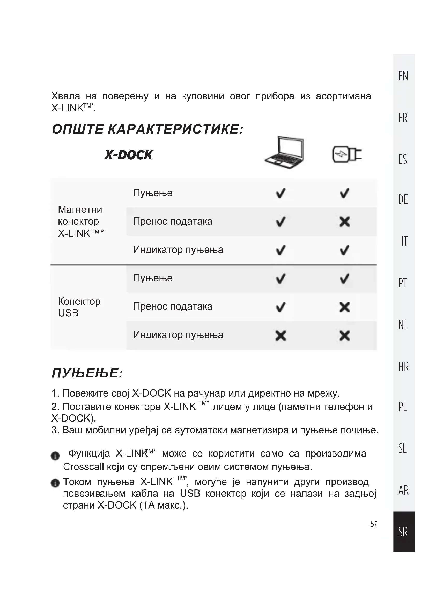 Функција X-LINK TM* може се користити само са производима Crosscall који су опремљени овим системом пуњења. Током пуњења X-LINK TM* , могуће је напунити други производ повезивањем кабла на USB конектор који се налази на задњој страни X-DOCK (1A макс.). Хвала на поверењу и на куповини овог прибора из асортимана X-LINK TM*