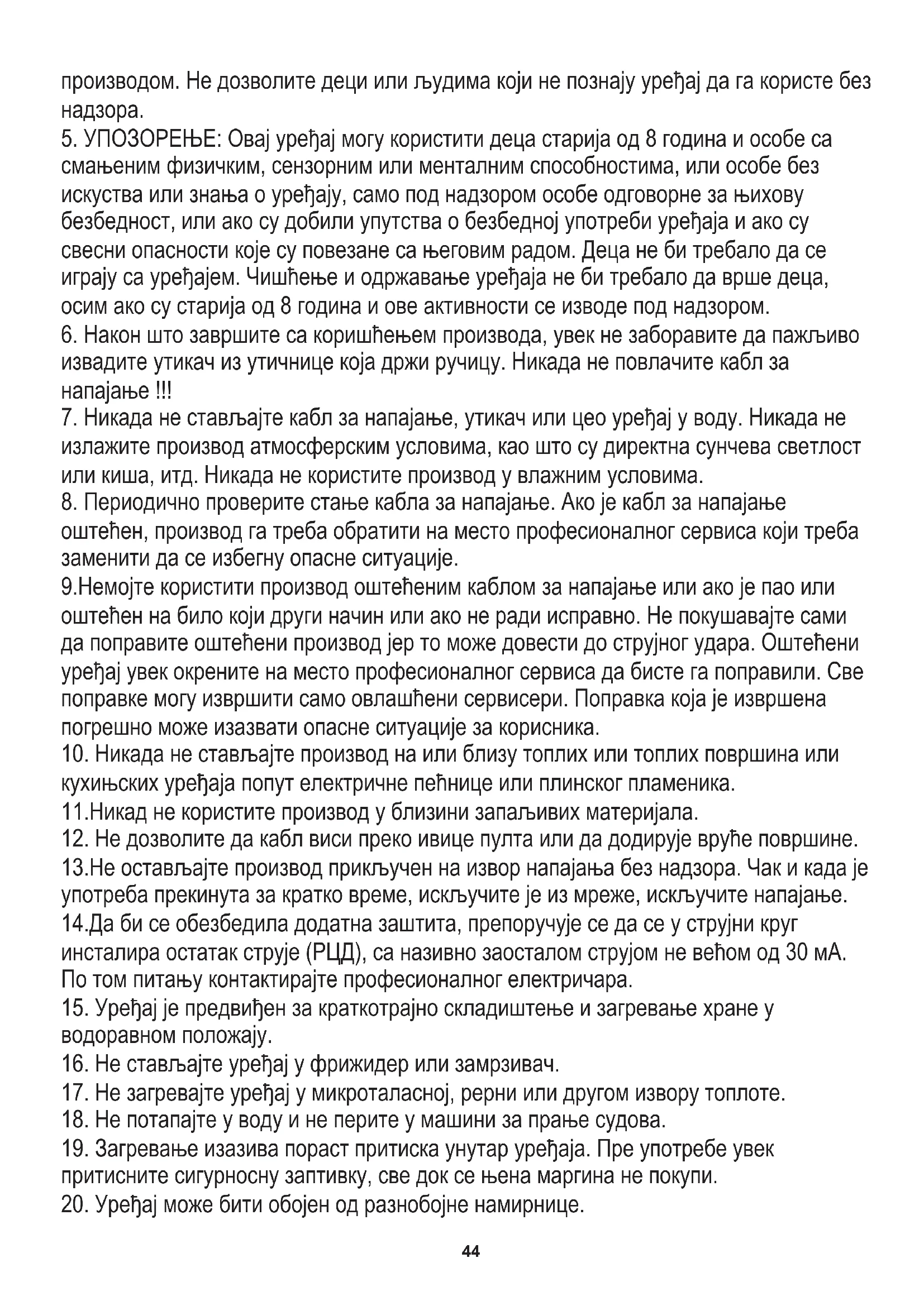 излажите производ атмосферским условима, као што су директна сунчева светлост или киша, итд. Никада не користите производ у влажним условима. 13.Не остављајте производ прикључен на извор напајања без надзора. Чак и када је употреба прекинута за кратко време, искључите је из мреже, искључите напајање. 9.Немојте користити производ оштећеним каблом за напајање или ако је пао или оштећен на било који други начин или ако не ради исправно. Не покушавајте сами да поправите оштећени производ јер то може довести до струјног удара. Оштећени уређај увек окрените на место професионалног сервиса да бисте га поправили. Све поправке могу извршити само овлашћени сервисери. Поправка која је извршена погрешно може изазвати опасне ситуације за корисника.