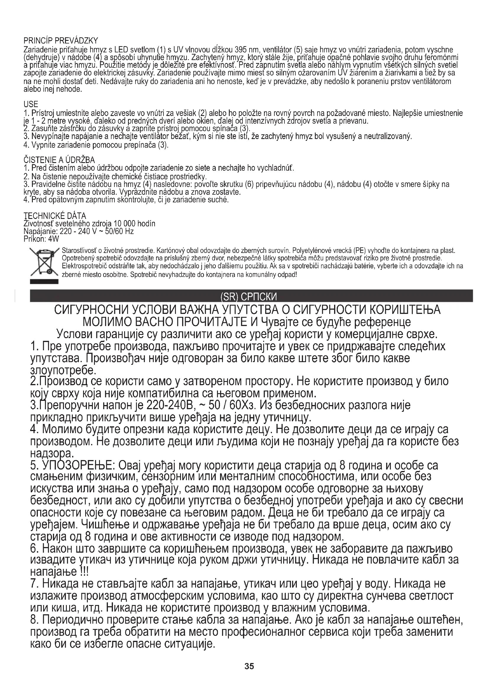 ПРИНЦИП РАДА Уређај привлачи инсекте ЛЕД светлошћу (1) са УВ таласном дужином од 395 нм, вентилатор (5) усисава инсекте унутар уређаја, а затим се суши (дехидрира) у посуди (4), услед чега инсекти умиру. Умерени инсекти који су још увек живи привлаче феромоне супротног пола своје врсте, привлачећи више инсеката. Употреба методе је важна за ефикасност. Укључите уређај у електричну утичницу пре него што укључите светло или изненада угасите сва јака светла за 10-20 минута. Користите уређај даље од места јаког УВ зрачења и флуоресцентног зрачења лампе, а деца такође могу да досегну. Не стављајте руке у уређај и не носите га док ради како бисте избегли повреде прста од вентилатора или неку другу незгоду.