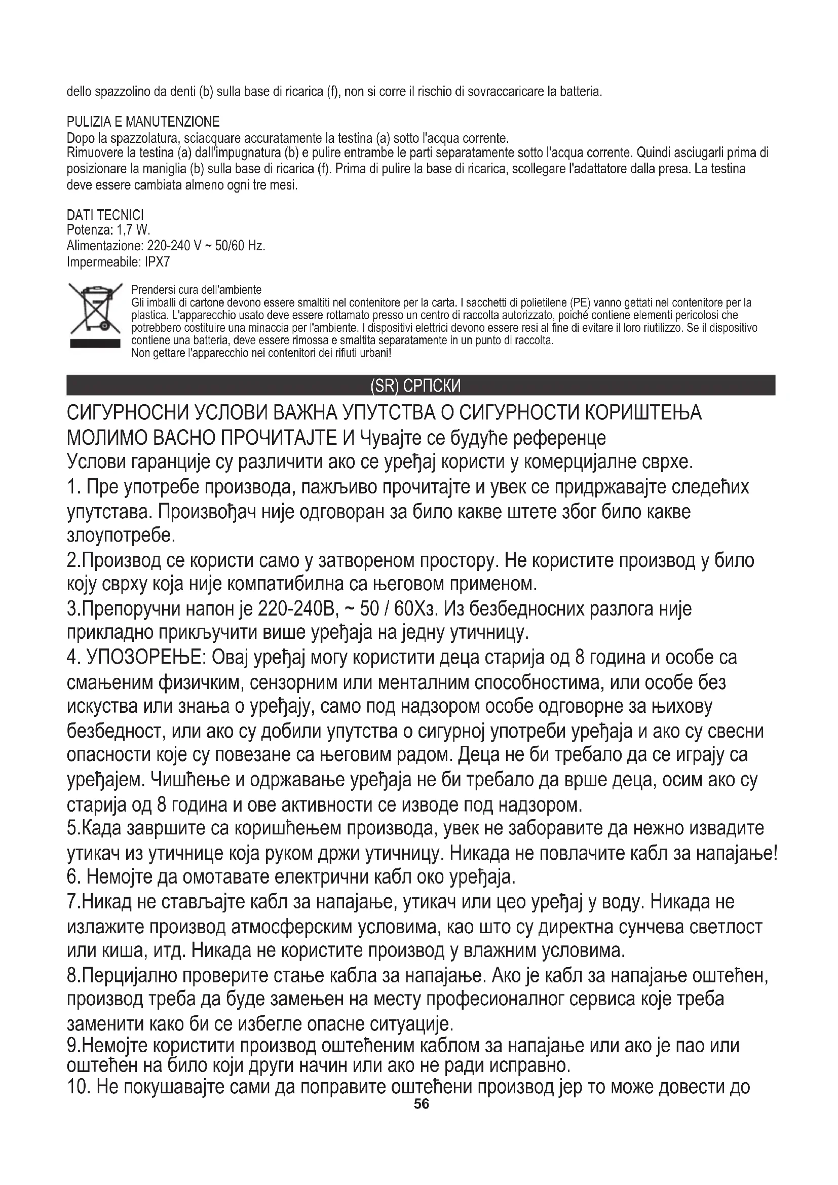 Укључите адаптер у електричну утичницу и ставите ручицу четке (б) на базу за пуњење (ф), индикатор пуњења (е) треба да светли. Потпуно пуњење траје најмање 24 сата и омогућава отприлике 6 тједана четкања. Светло означава да је пуњење у току (е). Једном када се потпуно напуни, лампица се аутоматски искључује. Ручку четкице за зубе (б) можете оставити на бази за пуњење (ф), не постоји ризик од препуњености батерије. ЧИШЋЕЊЕ И ОДРЖАВАЊЕ Након четкања темељно исперите главу (а) четкицом под текућом водом. Уклоните главу четкице (а) са дршке (б) и очистите оба дела одвојено под текућом водом. Затим их обришите пре него што ставите ручку (б) на базу за пуњење (ф). Пре чишћења базе за пуњење искључите адаптер из утичнице. Глава четке треба мењати најмање свака три месеца. ТЕХНИЧКИ ПОДАЦИ Снага: 1,7В Напајање: 220-240В ~ 50 / 60Хз. Водоотпоран: ИПКС7. За заштиту животне средине: молимо вас да одвојите картонске кутије и пластичне кесе и одложите их у одговарајуће канте за смеће. Коришћени уређај треба да буде испоручен на наменске сакупљане тачке због оштрих компоненти, што може утицати на животну средину. Немојте одлагати овај уређај у заједничку корпу за отпатке. (DK) DANSKI