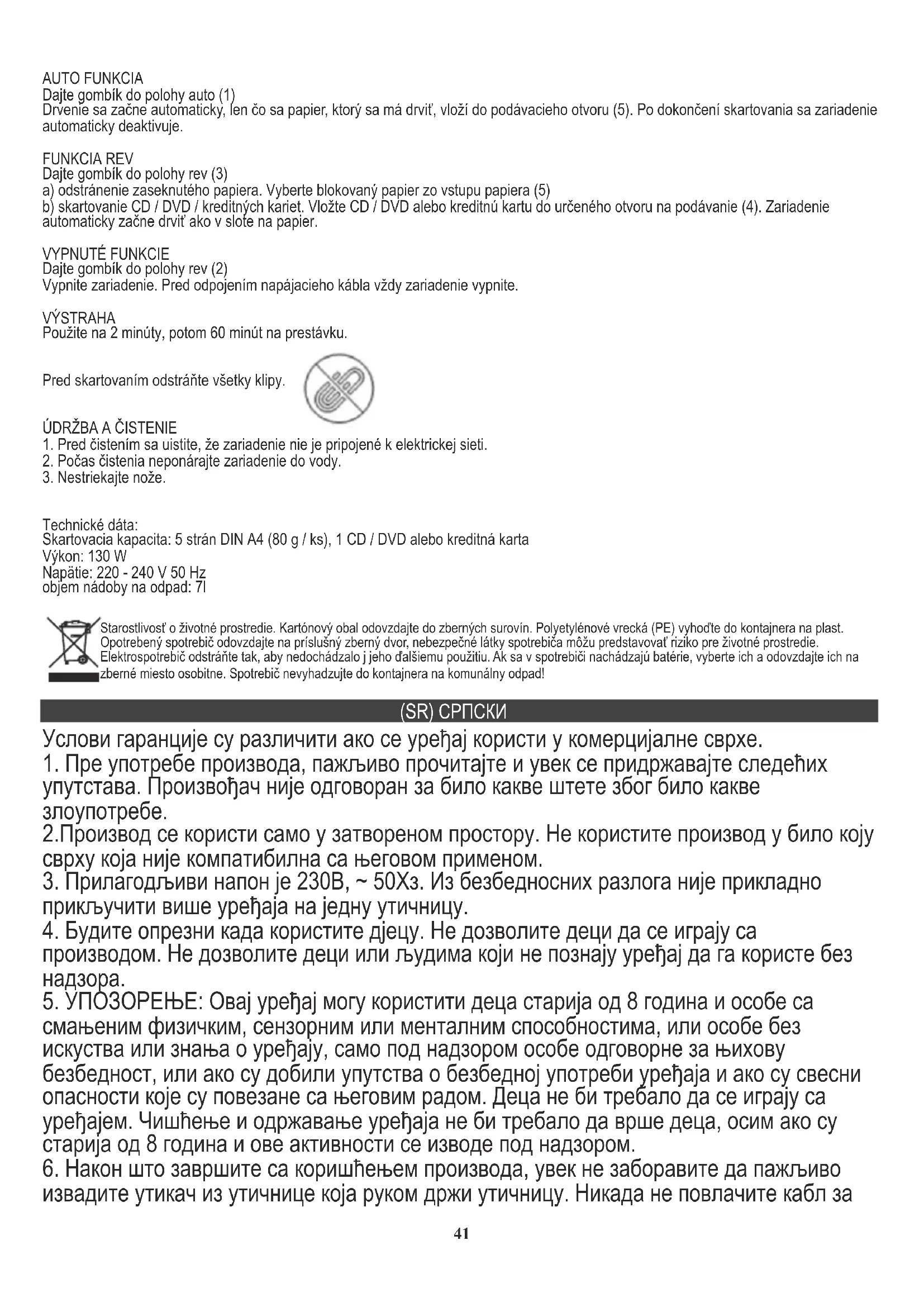 Технички подаци: Капацитет резања: 5 страница ДИН А4 (80 г / пц), 1 ЦД / ДВД или кредитна картица Снага: 130В Напон: 220-240В 50Хз запремина контејнера за отпад: 7л За заштиту животне средине: молимо вас да одвојите картонске кутије и пластичне кесе и одложите их у одговарајуће канте за смеће. Коришћени уређај треба да буде испоручен на наменске сакупљане тачке због оштрих компоненти, што може утицати на животну средину. Немојте одлагати овај уређај у заједничку корпу за отпатке. (DK) DANSKI Garantibetingelserne er forskellige, hvis enheden bruges til kommercielt formål.