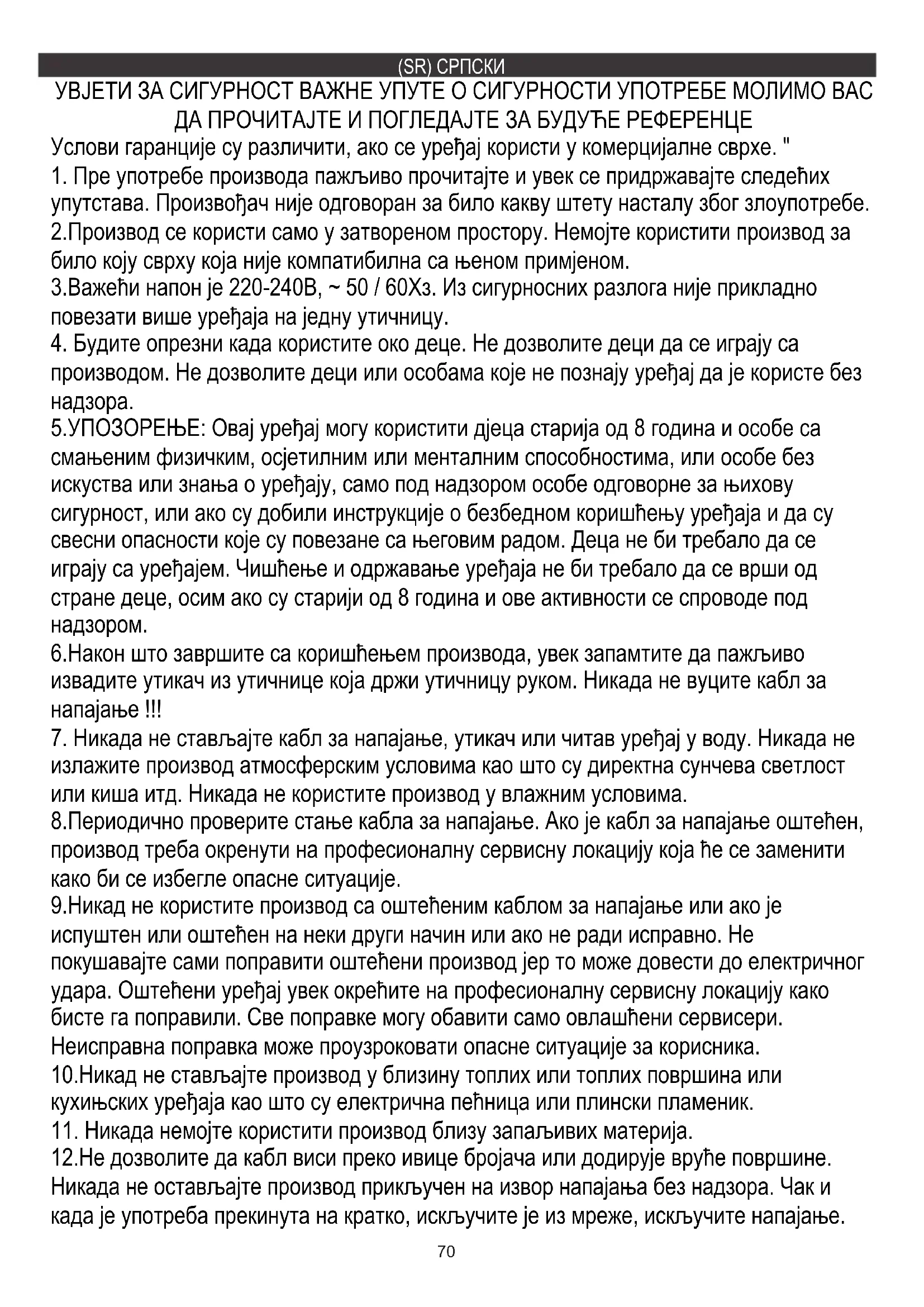 5.УПОЗОРЕЊЕ: Овај уређај могу користити дјеца старија од 8 година и особе са смањеним физичким, осјетилним или менталним способностима, или особе без искуства или знања о уређају, само под надзором особе одговорне за њихову сигурност, или ако су добили инструкције о безбедном коришћењу уређаја и да су свесни опасности које су повезане са његовим радом. Деца не би требало да се играју са уређајем. Чишћење и одржавање уређаја не би требало да се врши од стране деце, осим ако су старији од 8 година и ове активности се спроводе под
