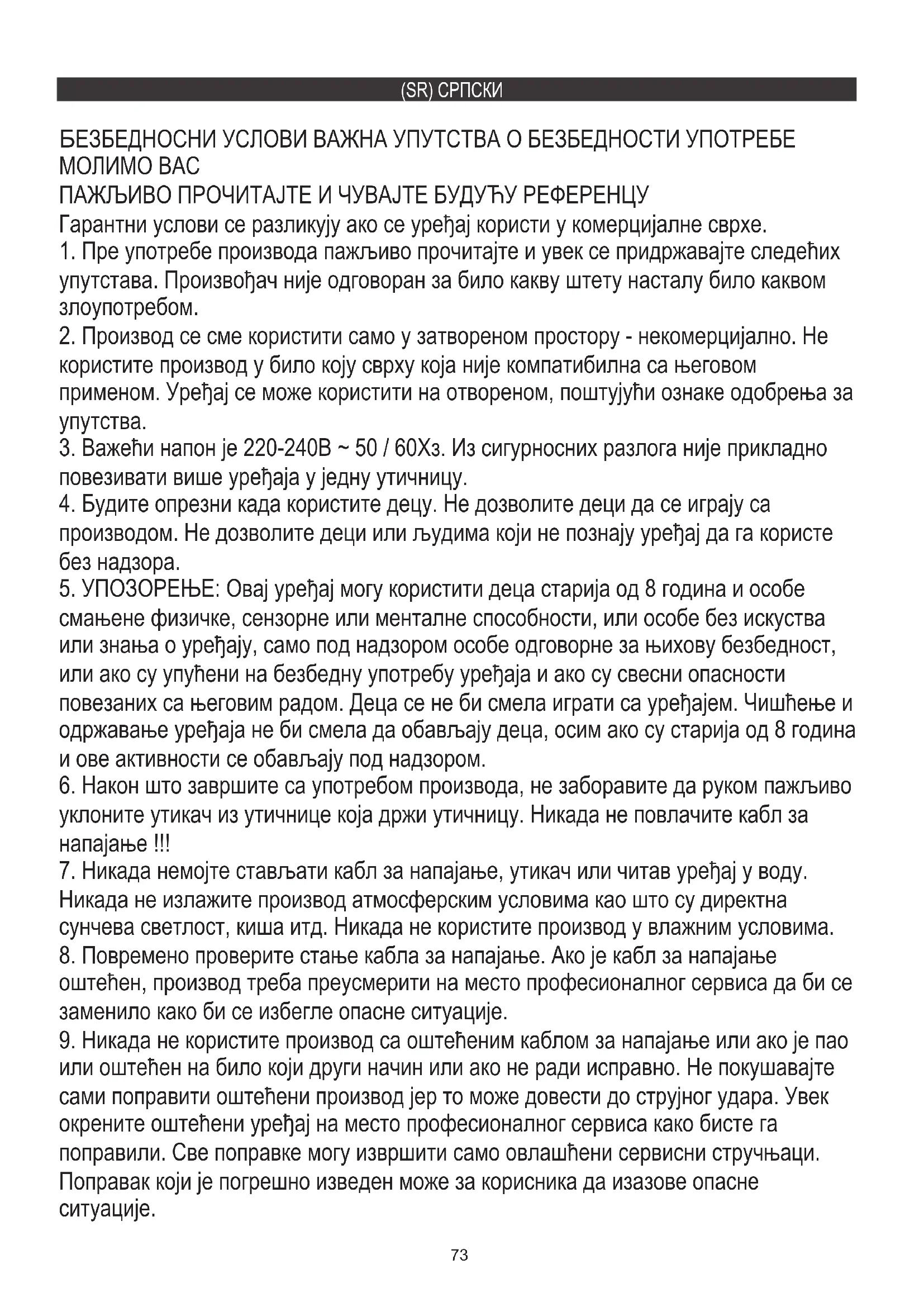 уклоните утикач из утичнице која држи утичницу. Никада не повлачите кабл за напајање !!! (SR) СРПСКИ74