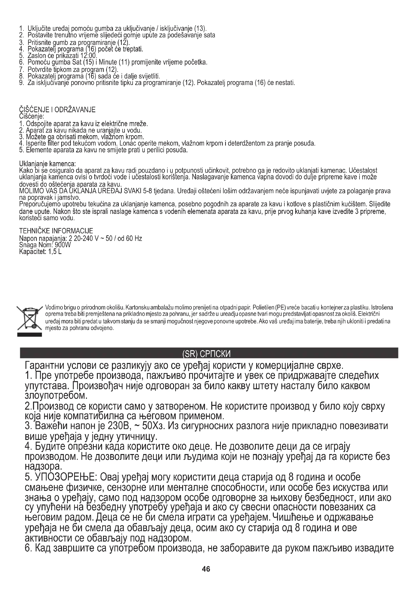 Уклањање каменца: Да би се осигурало да апарат за кафу ради поуздано и буде у потпуности ефикасан, потребно га је редовно уклањати каменац. Учесталост уклањања каменца зависи од тврдоће воде и учесталости употребе. Наталожени камен креча доводи до дуже припреме кафе и може довести до оштећења апарата за кафу. МОЛИМО ДА УРЕЂАЈ КАПИЈАТЕ СВАКИХ 5-8 недеља. Уређаји оштећени лошим одржавањем неће испуњавати услове за потраживања гаранције и поправке. Препоручујемо употребу течности за уклањање каменца, посебно погодних за апарате за кафу и котлове са пластичним кућиштем. Следите дата упутства. Након испирања наслага каменца са водених елемената апарата за кафу, извршите 3 припреме воде користећи само воду пре првог кувања кафе. ТЕХНИЧКЕ ИНФОРМАЦИЈЕ Напон напајања: 2 20-240 В ~ 50 /60 Хз Снага Ном: 900В Капацитет: 1,5 L