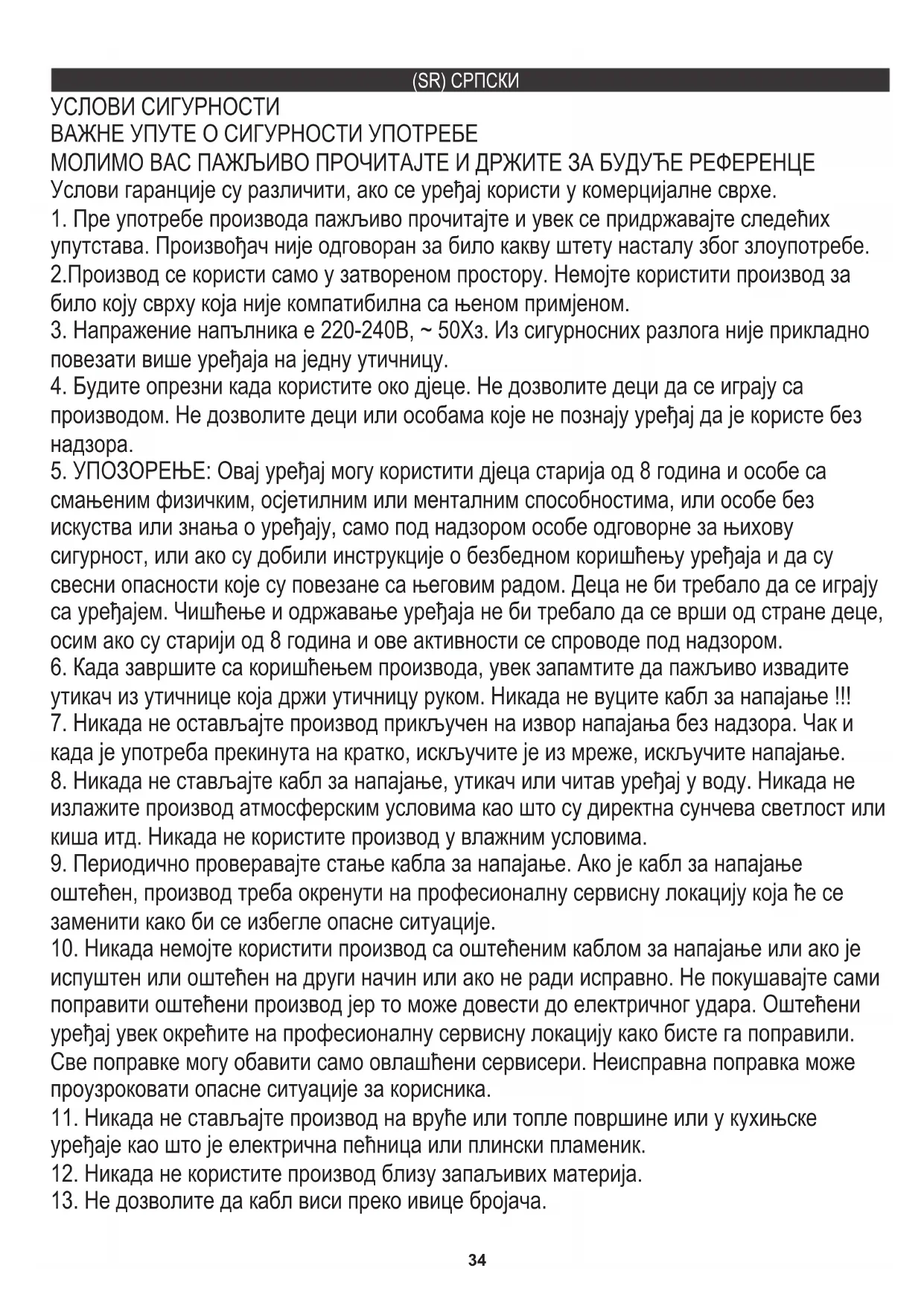 упутстава. Произвођач није одговоран за било какву штету насталу због злоупотребе. Услови гаранције су различити, ако се уређај користи у комерцијалне сврхе. МОЛИМО ВАС ПАЖЉИВО ПРОЧИТАЈТЕ И ДРЖИТЕ ЗА БУДУЋЕ РЕФЕРЕНЦЕ ВАЖНЕ УПУТЕ О СИГУРНОСТИ УПОТРЕБЕ